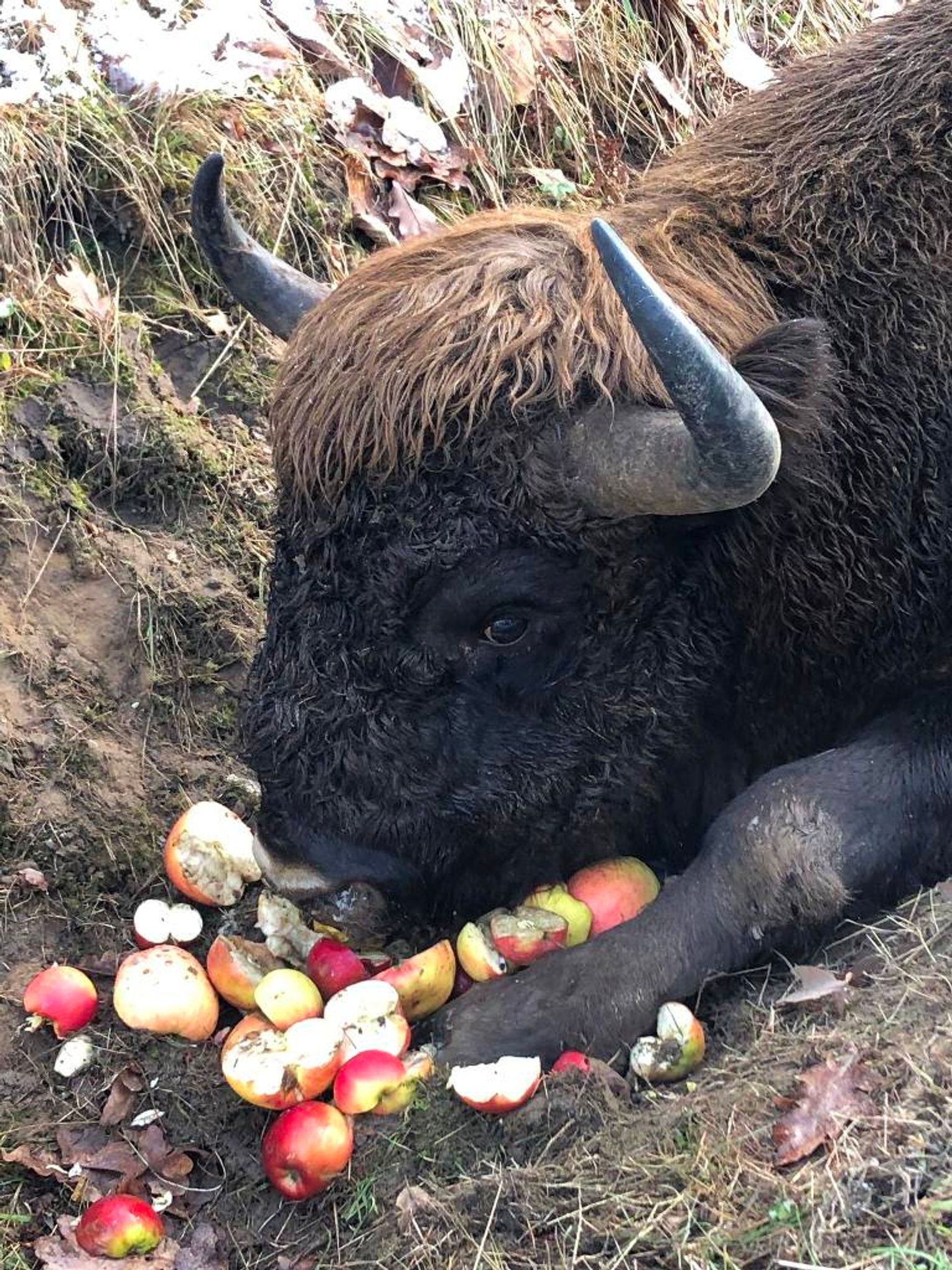 – Wyruszyłam w sobotę 25 listopada, ok. godz. 14:30, na wędrówkę po lesie. Ok. 1,5 km od głównej drogi na Rokitno, przy drodze pożarowej nr 12, zauważyliśmy z partnerem, że coś leży w rowie. Podeszliśmy bliżej i zobaczyliśmy, że to żubr. Nie wstał, kiedy nas zobaczył, więc stwierdziliśmy, że coś mu dolega. Wtedy próbowaliśmy podejść jeszcze bliżej. Żubr tylko ruszał łbem – opowiada Monika Daniluk.