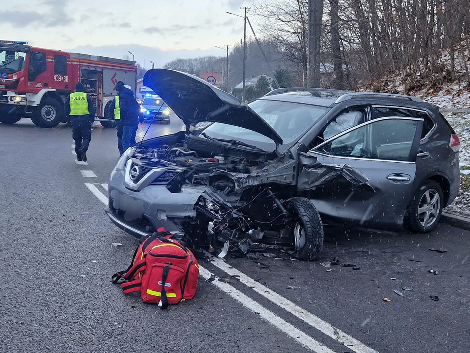 Zderzyły się osobowy nissan x-trail z pojazdem ciężarowym. Obecnie droga jest w tym miejscu nieprzejezdna. Ruch ciężarowy został całkowicie wstrzymany.