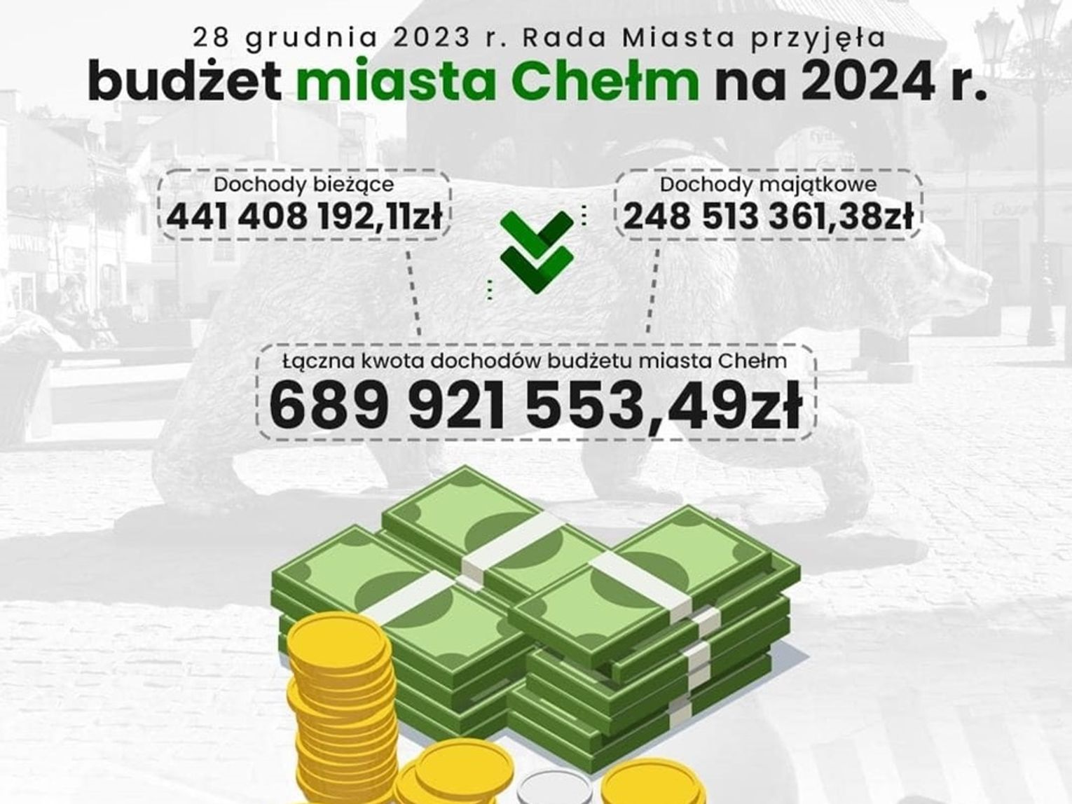 Łączna kwota dochodów budżetu miasta Chełm to 689 921 553,49 zł, z tego dochody bieżące w kwocie 441 408 192,11 zł i dochody majątkowe - 248 513 361,38 zł. Wydatki zaplanowano z kolei na poziomie 747 545 904,43 zł, z tego wydatki bieżące w kwocie 424 642 095,98 zł i wydatki majątkowe - 322 903 808,45 zł.