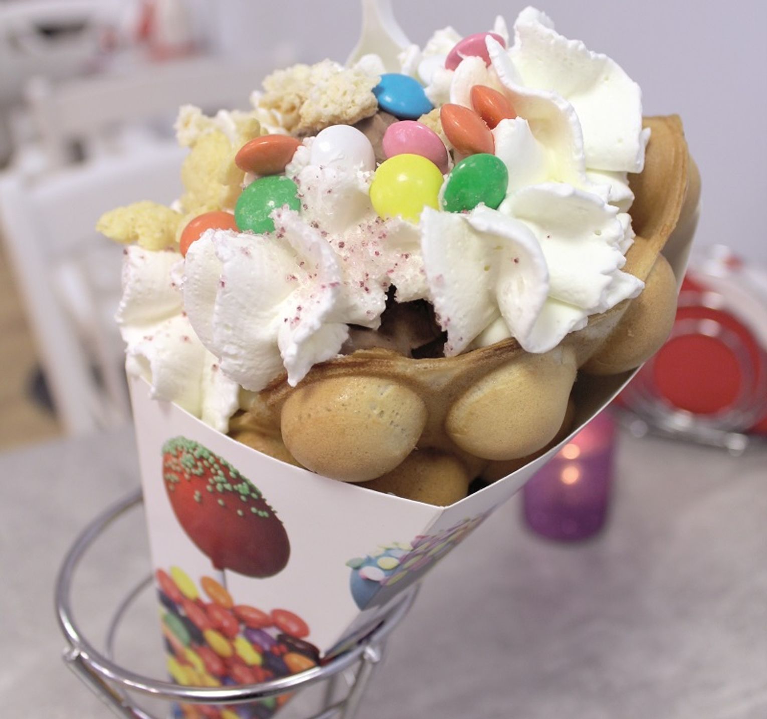 Bubble Waffel, specjalność podawana w Chatce Niedźwiadka, to bąbelkowe wafle zawijane w rożki. Swój rodowód mają w Hongkongu, gdzie sprzedawane są na ulicach jako jeden z przysmaków azjatyckiego street foodu.