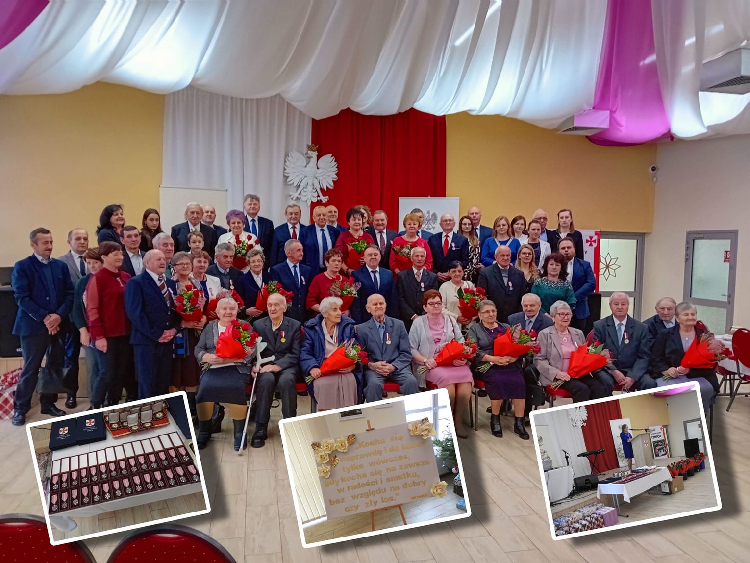 Nie wszyscy zaproszeni mogli zjawić się osobiście, w takich sytuacjach medale odebrali najbliżsi. Burmistrz pod adresem dostojnych Jubilatów skierował słowa uznania i podziękowania za godne i długie pożycie małżeńskie oraz za piękny przykład dla młodego pokolenia. Do życzeń dołączyli się także zaproszeni goście: Senator Józef Zając, Starosta Andrzej Leńczuk oraz Radny Powiatowy Janusz Szpak. Oprócz medali, jubilaci otrzymali także dyplomy, listy gratulacyjne, kwiaty i okolicznościowe upominki. Nie zabrakło również symbolicznego toastu. O szczególną atmosferę zadbały dzieci ze Szkoły Podstawowej w Izbicy oraz soliści współpracujący z Samorządowym Ośrodkiem Kultury i Sportu w Izbicy.