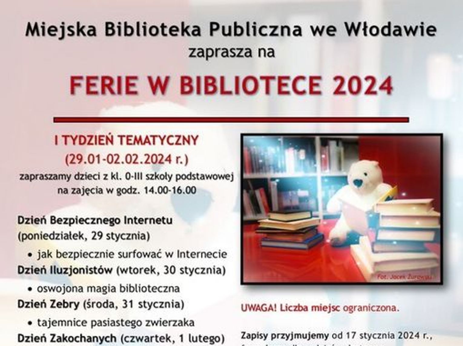Pierwszy tydzień tematyczny obejmie dni od 29 stycznia do 02 lutego 2024 r. Z atrakcji skorzystają dzieci z klas 0-III, na zajęciach w godzinach od 14.00 do 16.00. Między innymi odbędzie się dzień iluzjonisty, zebry i zakochanych. Lista miejsc jest ograniczona, a uczestnicy powinni posiadać kartę biblioteczną. Obowiązuje też zmiana obuwia.
