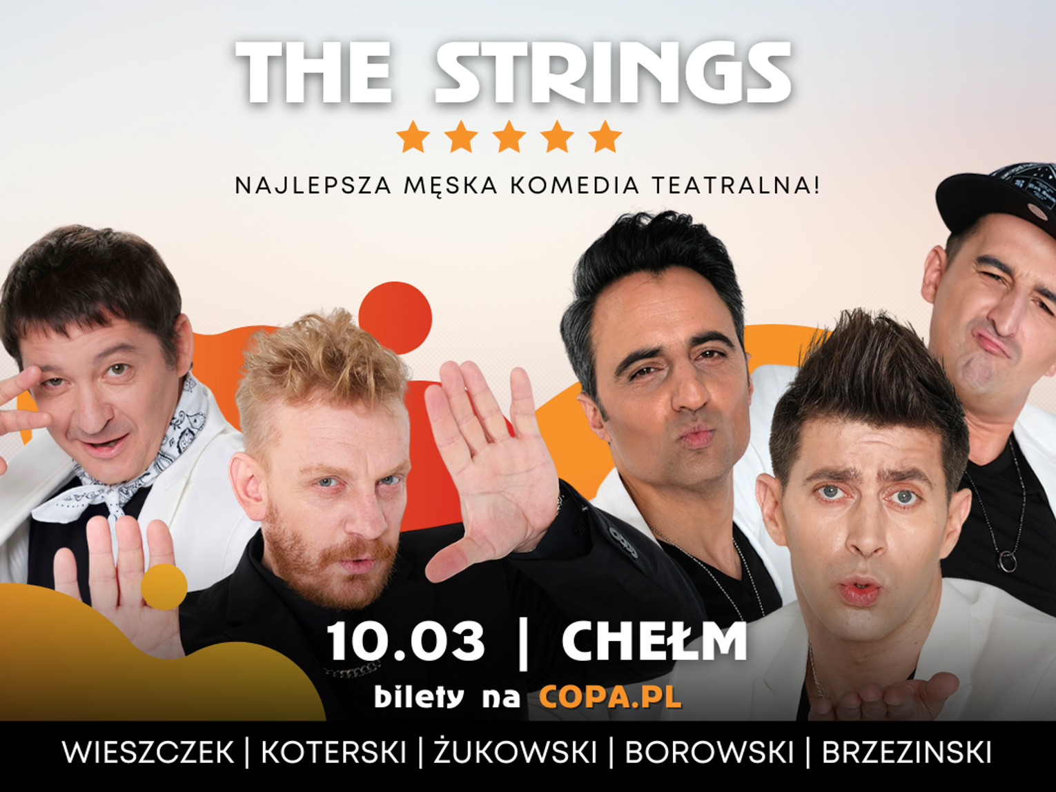 Niebanalne żarty, moc przyjaźni, grupa 5 mężczyzn, którzy spotkali się będąc na życiowym zakręcie. W tle muzyka, która osładza ich perypetie. To krótki opis spektaklu autorstwa i reżyserii Macieja Kowalewskiego "The Strings - pełna humoru i zwrotów akcji sztuka, która po prostu przywraca wiarę w marzenia oraz siłę przyjaźni. Kim są nasi bohaterowie? To Ernest, Kotlet i Manuel. Ernest rozpacza, ponieważ żona wyrzuciła go z mieszkania i z życia. Kotlet za dużo pije, a na dodatek został zwolniony z zespołu chippendales, który sam założył. Manuel właśnie wyleciał z hukiem z legendarnego zespołu Figi, który dziś koncertuje w muszli. Załamani panowie na zakręcie życiowym postanawiają wziąć sprawy w swoje ręce i zakładają zespół The Strings. Kto do nich dołączy? Jak potoczą się ich losy? O tym przekonacie się będąc na widowni.