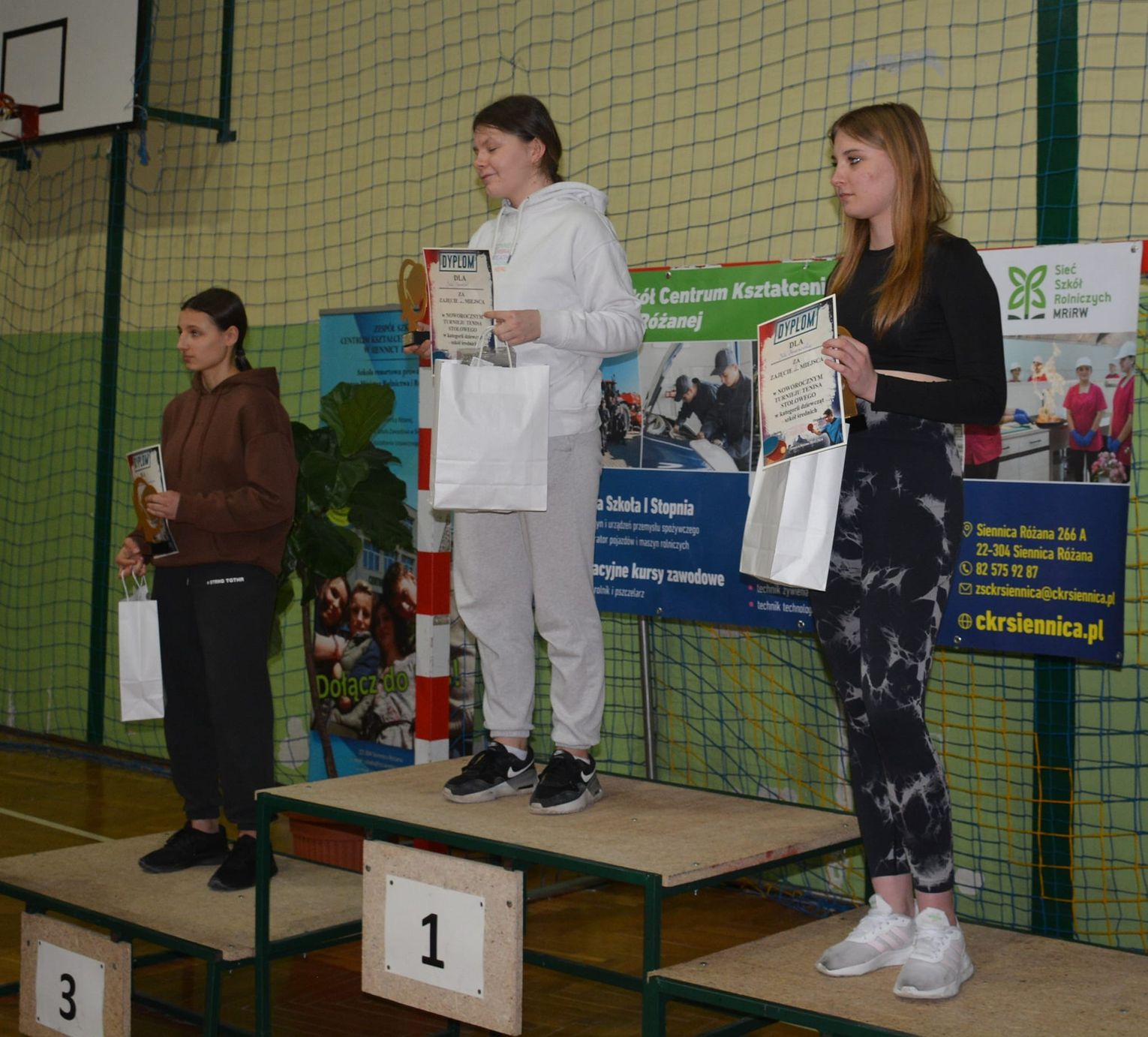 Pingpongiści, którzy zajęli miejsca 1 - 3 otrzymali statuetki, a za lokaty 1 - 6 organizatorzy przyznali nagrody rzeczowe i dyplomy. Trofea wręczyli dyrektor ZS CKR Stanisław Buk w asyście organizatorów turnieju, którymi byli nauczyciele wychowania fizycznego - Beata Maluga, Mirosław Ożóg, Jacek Radelczuk i Dawid Jaruga.