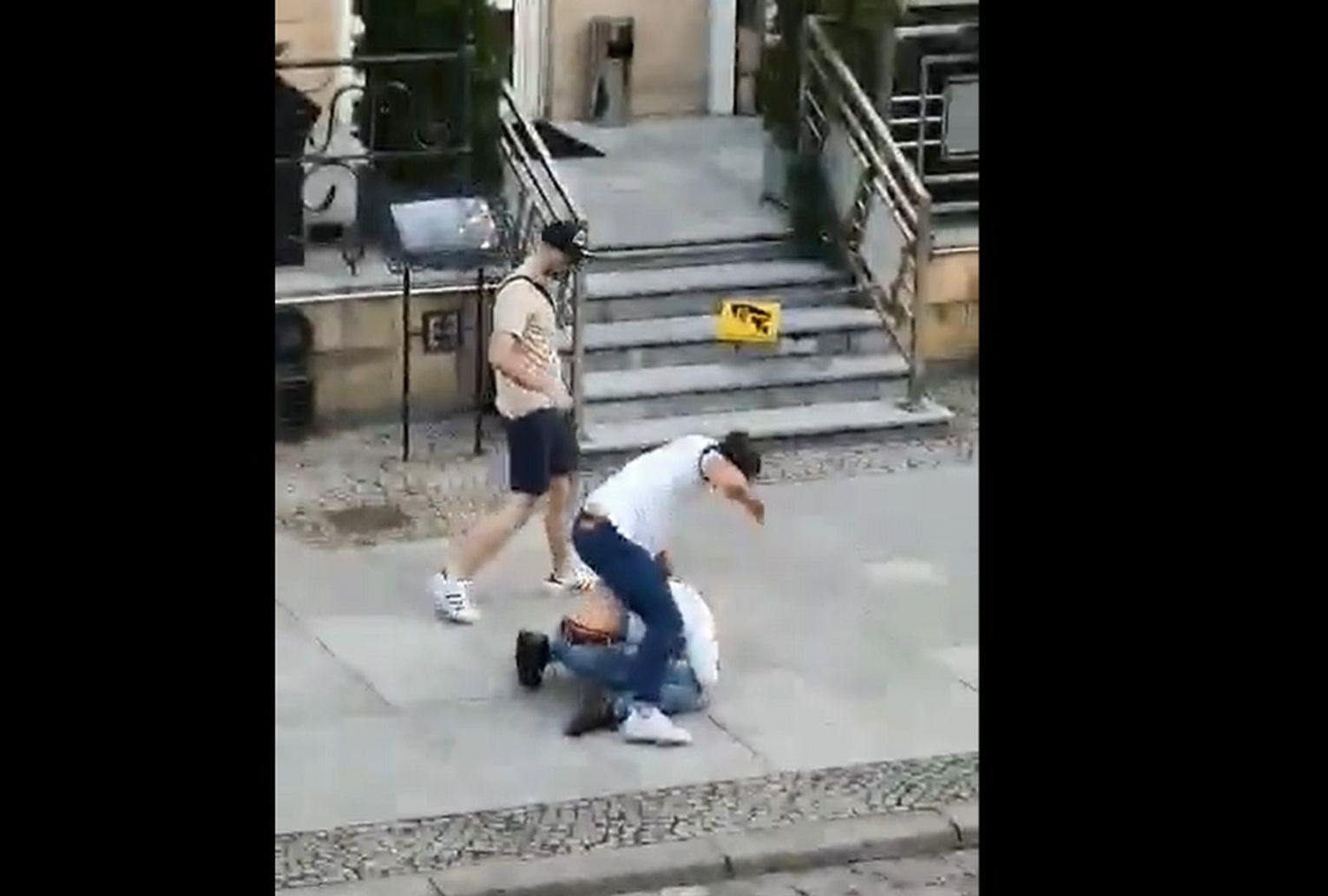 Na filmie widać dwóch mężczyzn. Jeden leży skulony na chodniku. Drugi stoi nad nim. Okłada ofiarę pięściami i odchodzi. Wszystko trwa 14 sekund.