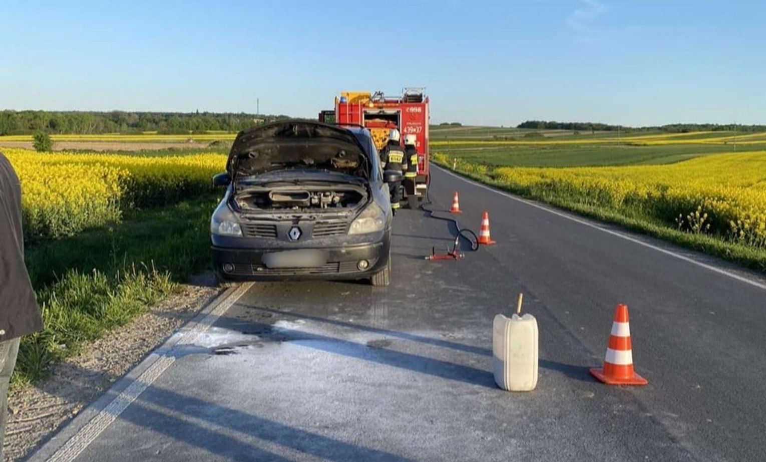 Do zdarzenia doszło w poniedziałek (29 kwietnia) na drodze w Kraśniczynie, na trasie w stronę Skierbieszowa. Właścicielowi palącego się renault najpierw pomogli inni kierowcy, przejeżdżający tą drogą. Użyli dwóch gaśnic, by stłumić ogień pod maską auta.