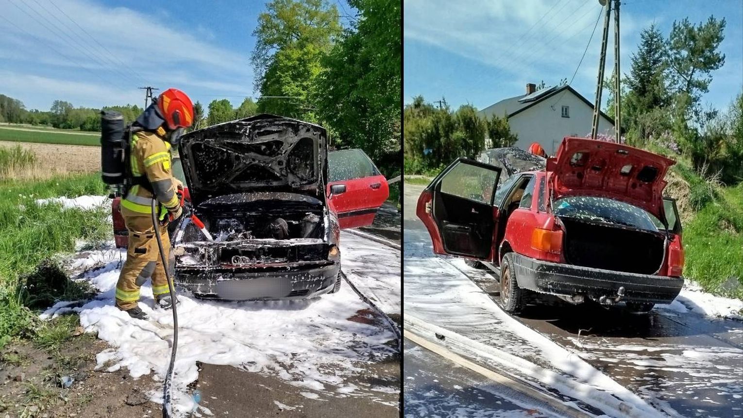Auto nagle stanęło w ogniu przed godziną 11 na gminnej drodze przy wjeździe do wsi. Kierowca zaalarmował straż pożarną. Gdy ratownicy przyjechali na miejsce, pojazd stał na poboczu i cały płonął. Ugasili ogień i zabezpieczyli miejsce zdarzenia.
