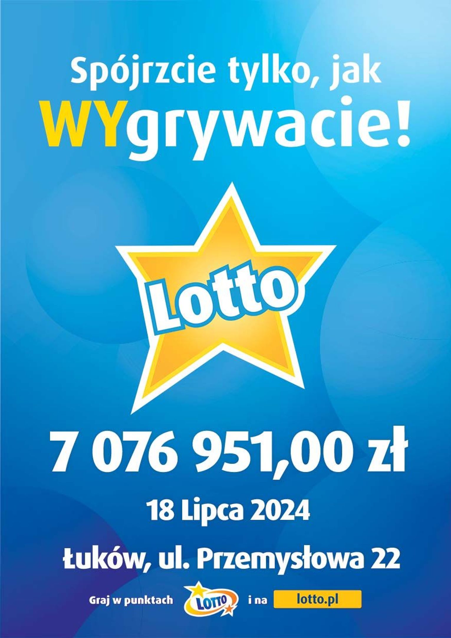 Dokładnie 7 076 951,00 zł wygrał ktoś, kto odwiedził punkt LOTTO przy ul. Przemysłowej 22 w Łukowie.