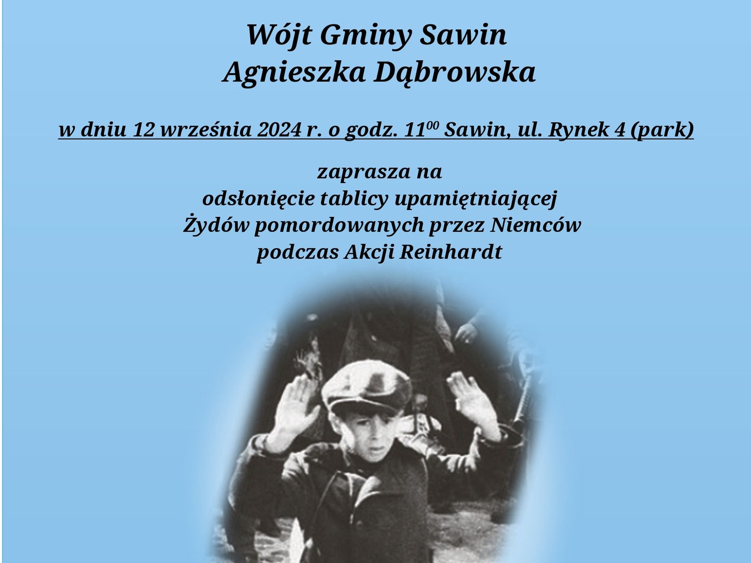 W samym sercu gminy, przy ul. Rynek 4 w Sawinie, zostanie odsłonięta tablica poświęcona 80. rocznicy zagłady polskich Żydów. Jest to symboliczne miejsce, które przypomni o bolesnej historii i tragicznych wydarzeniach.