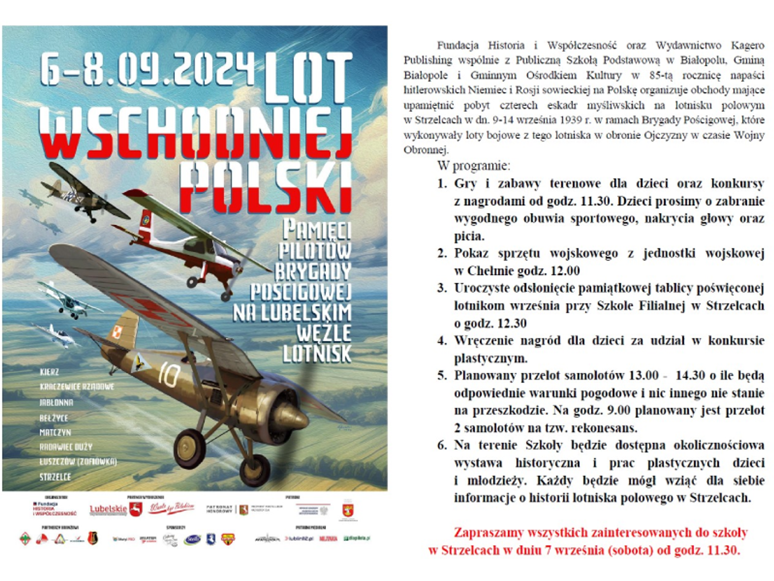 Inicjatorami wydarzenia są Fundacja Historia i Współczesność oraz Wydawnictwo Kagero Publishing, we współpracy z Publiczną Szkołą Podstawową w Białopolu i Gminnym Ośrodkiem Kultury zapraszają na obchody związane z upamiętnieniem pilotów Brygady Pościgowej na lubelskim węźle lotnisk pod nazwą "Lot wschodniej Polski".