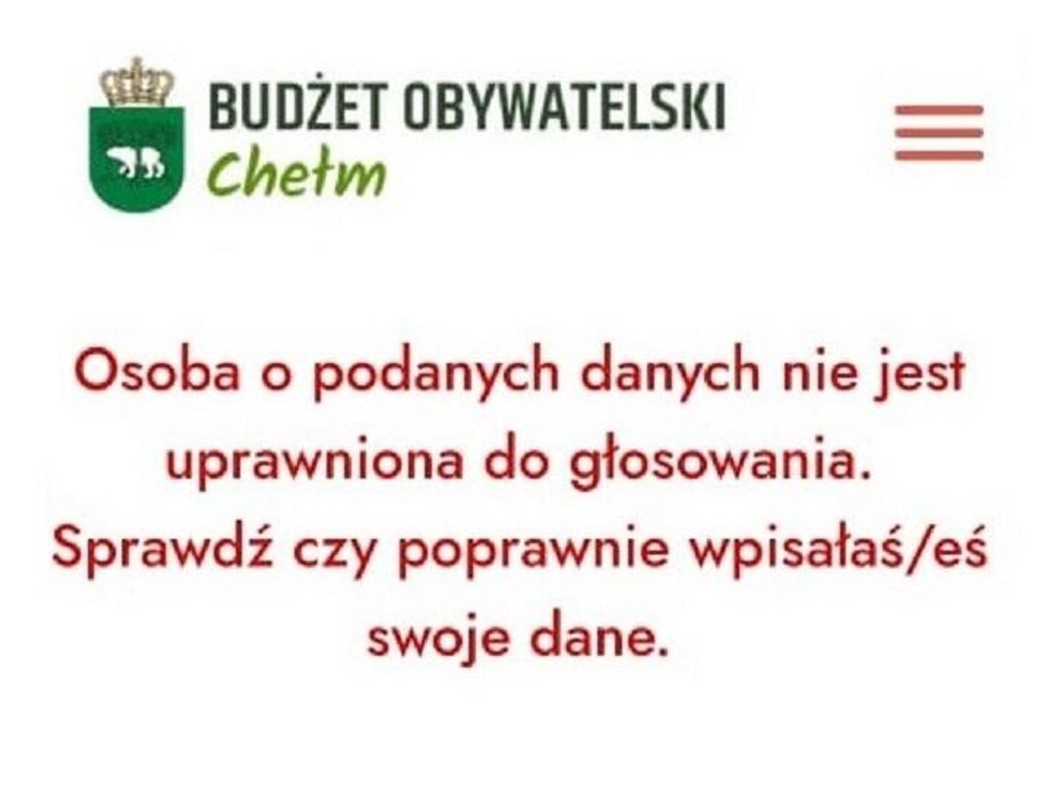 Jeśli masz problem z oddaniem głosu, skontaktuj się niezwłocznie z Rzecznikiem Praw Mieszkańców. Można to zrobić osobiście w Urzędzie Miasta Chełm (ul. Lubelska 65, pokoju nr 15), telefonicznie pod numerem: 82 564 33 26 lub mailowo: [email protected].