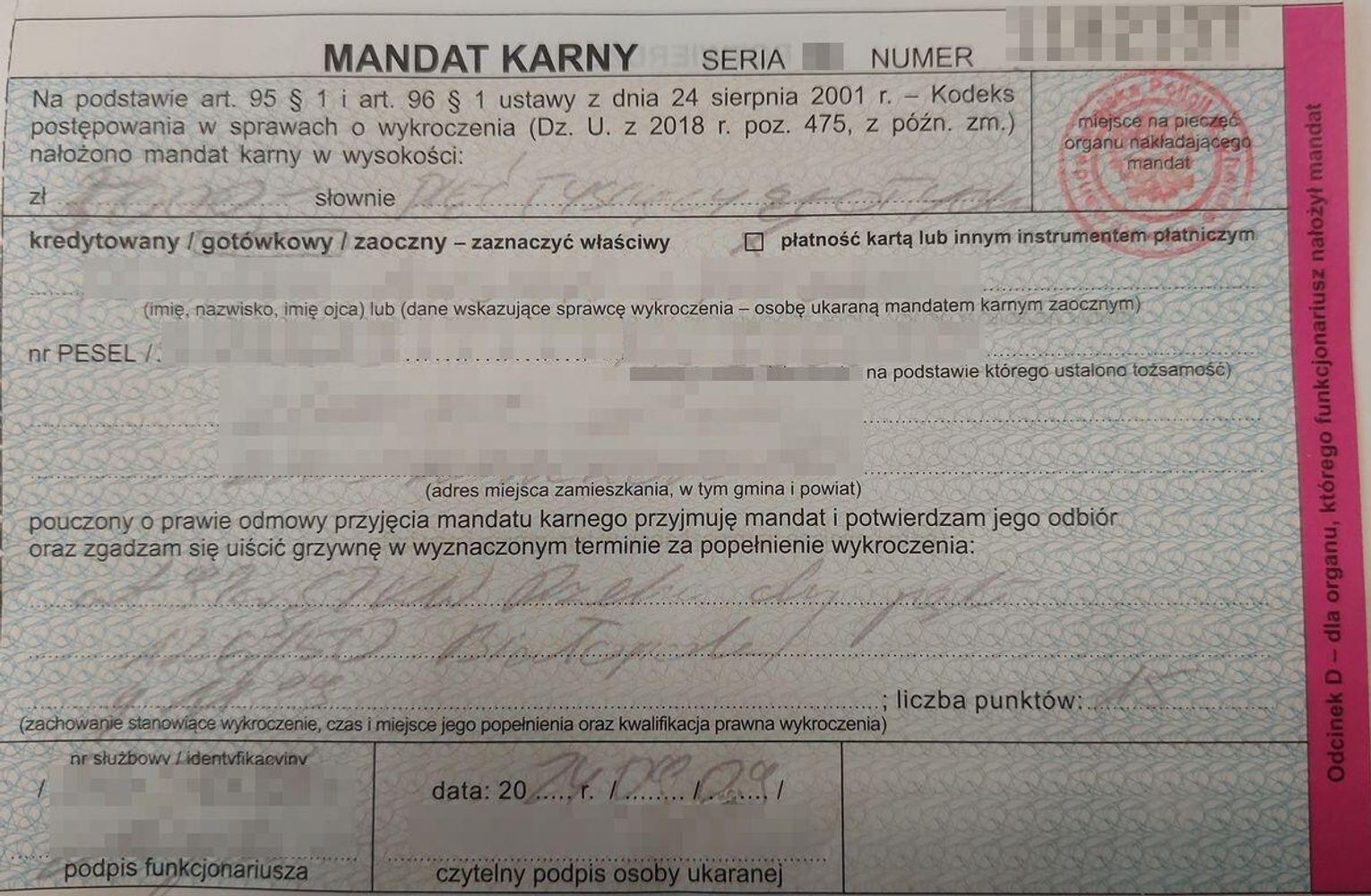 Funkcjonariusze szybko ustalili, że wykroczenie popełnione zostało przez niego po raz drugi. W warunkach recydywy otrzymał mandat w wysokości 5 tysięcy złotych. Na 3 miesiące stracił również prawo jazdy, a jego konto zasiliło 15 punktów karnych.