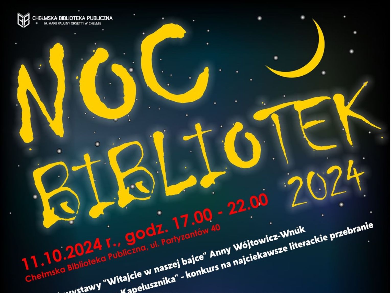 Noc bibliotek to ogólnopolska akcja, która ma przekonać do czytania poprzez promocję lokalnych bibliotek jako najbliższych miejsc spotkań z kulturą, z różnorodnymi zasobami i bezpłatną ofertą. Chełmska Biblioteka Publiczna przygotowała coś zarówno do dorosłych, jak i dzieci.