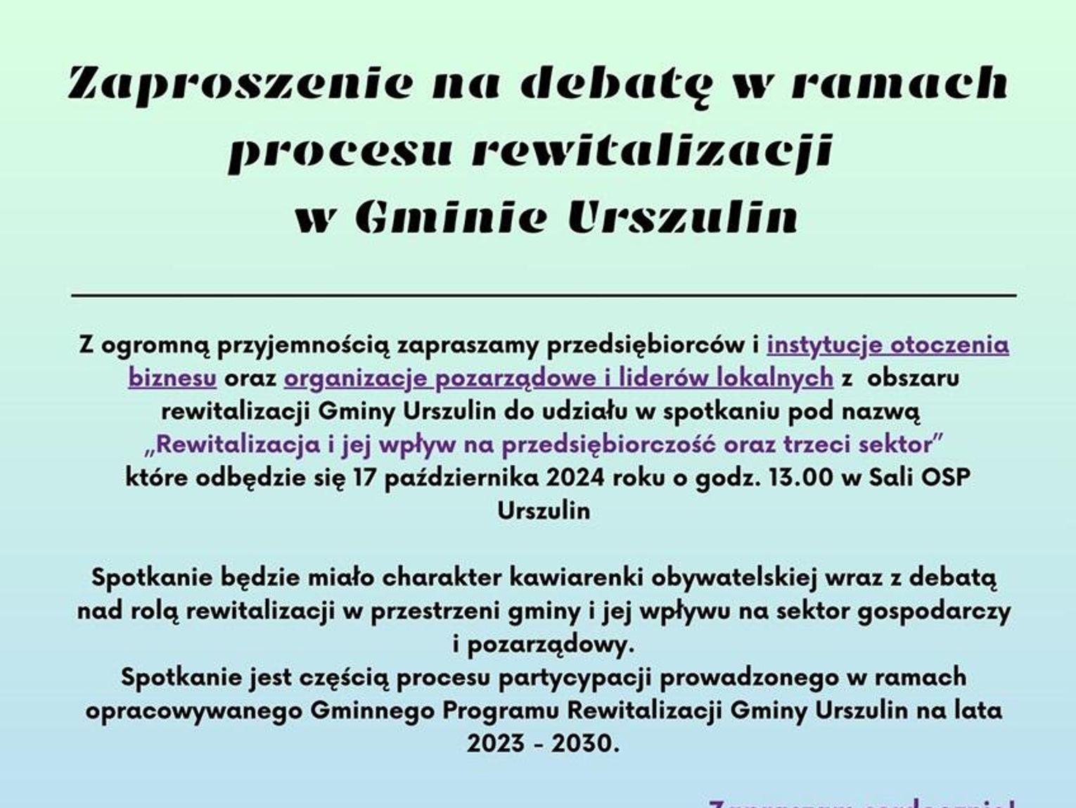 Debata jest częścią szerszego procesu partycypacji społecznej prowadzonego w ramach Gminnego Programu Rewitalizacji. Zakłada on realizację działań mających na celu ożywienie zdegradowanych obszarów, poprawę infrastruktury oraz wspieranie inicjatyw gospodarczych i społecznych. W trakcie spotkania uczestnicy będą mieli okazję dowiedzieć się więcej o założeniach programu, a także podzielić się swoimi spostrzeżeniami i pomysłami na dalsze działania.