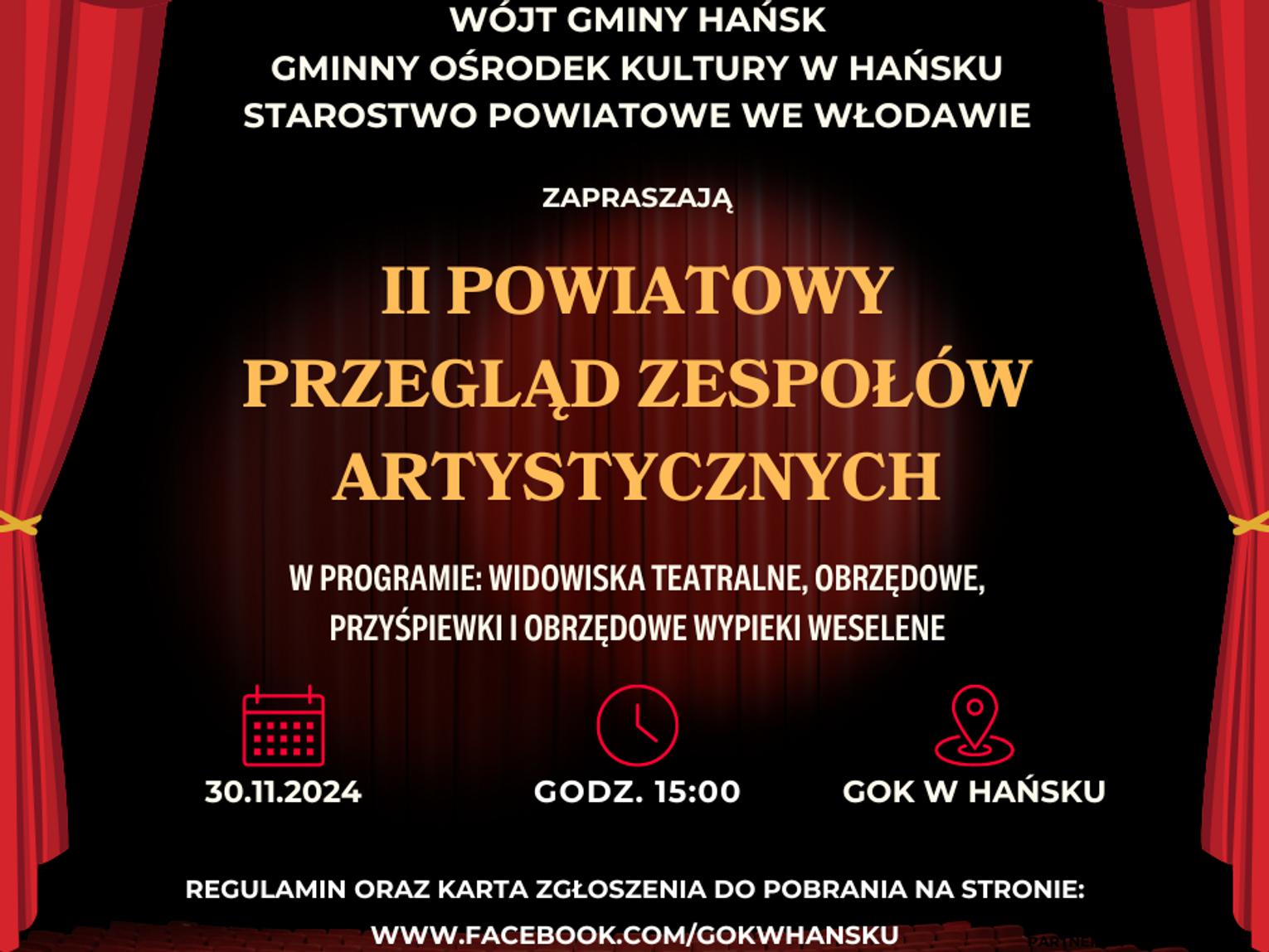 Wszystkie zespoły artystyczne zainteresowane udziałem w przeglądzie proszone są o zapoznanie się z regulaminem oraz wypełnienie karty zgłoszeniowej, które dostępne są na profilu Gminnego Ośrodka Kultury w Hańsku. Zgłoszenia należy przesłać do 22 listopada.