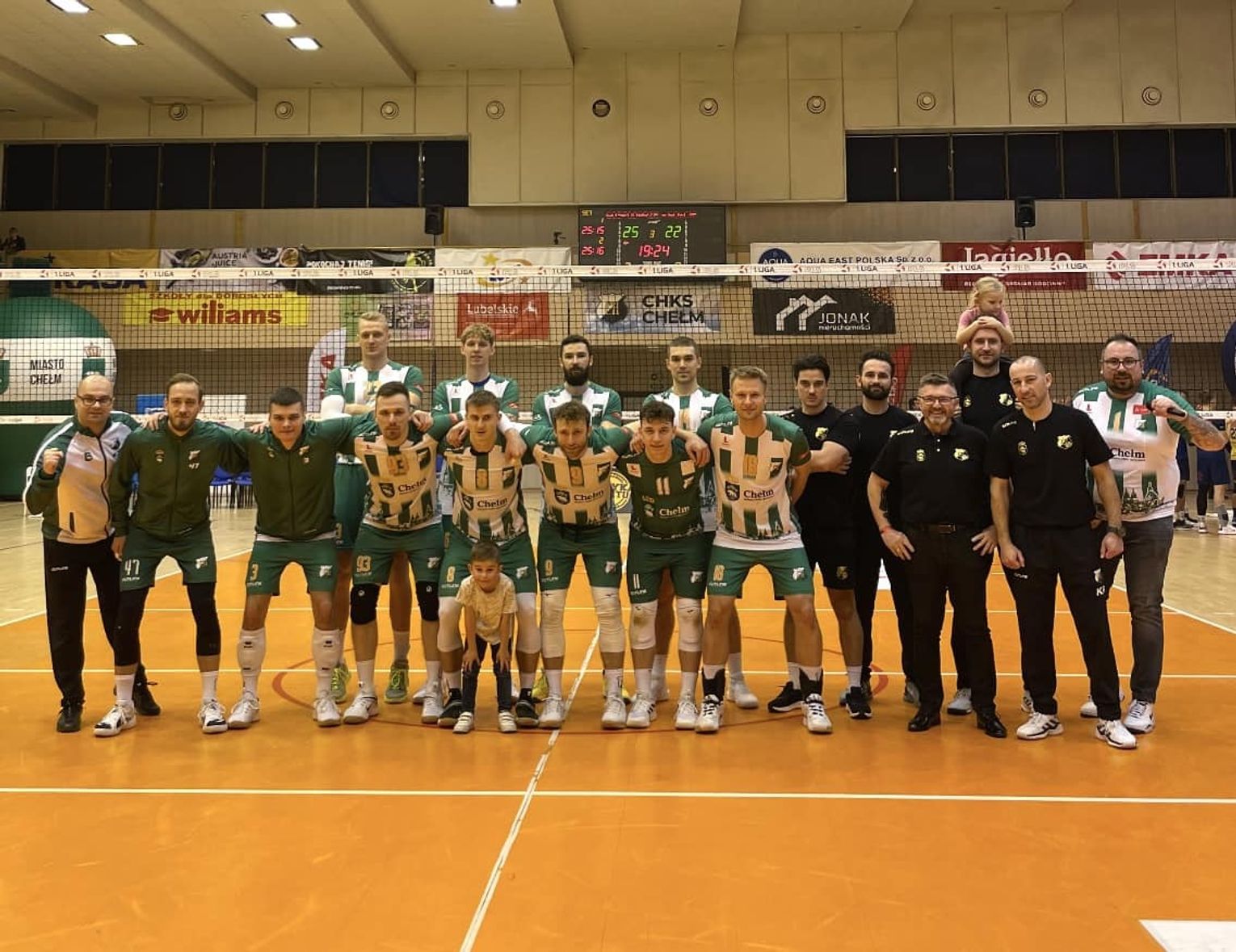 Po wyrównanym początku pierwszego seta, przy stanie 9:9 to biało-zieloni zaczęli wyraźnie odskakiwać rywalom przy obecności Jędrzeja Gossa w polu serwisowym, którego dobrą passę kontynuował następnie przez chwilę Paweł Rusin. ChKS prowadził 18:10 i wtedy goście próbowali jeszcze cokolwiek ugrać. Ich starania na niewiele się zdały, ponieważ gospodarze byli świadomi, że ta partia jest już ich i dopięli swego, wykorzystując również błędy przeciwników. Kropkę nad "i" w tej partii postawił Jędrzej Goss asem serwisowym.