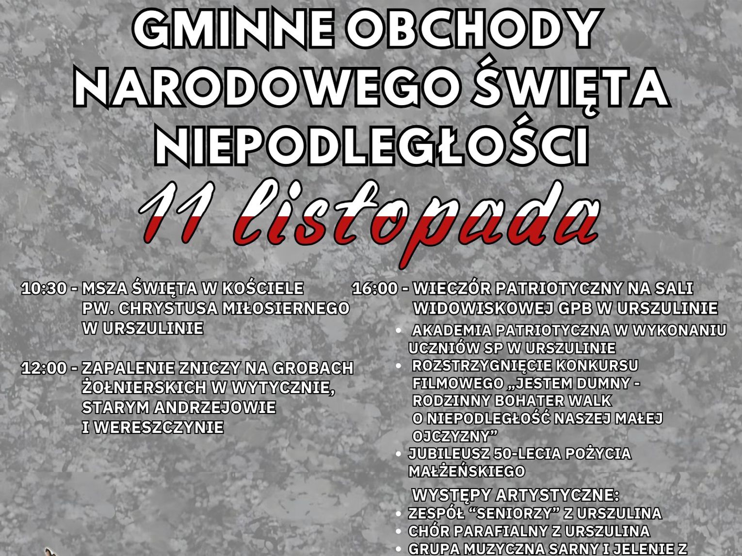 W imieniu organizatorów zapraszamy wszystkich mieszkańców gminy Urszulin oraz okolicznych miejscowości do wspólnego świętowania Narodowego Święta Niepodległości.