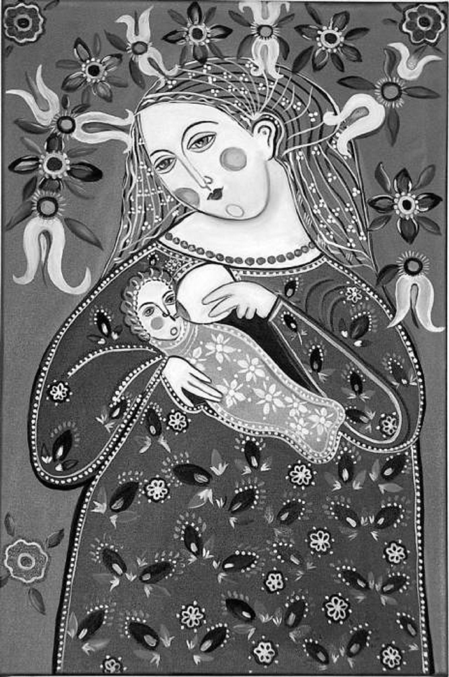 Na wystawie w bibliotece artystka zaprezentuje cykl Madonn karmiących. Wszystkie prace są wykonane techniką olejną na płótnie, a postaci Matki Bożej zostały namalowane przy użyciu skrajnych barw czarnej i białej. Ten ascetyczny obraz Matki nawiązuje do okresu brzemienności kobiety wybranej przez Boga, Jej losu, odtrącenia także tułaczki, Matki cierpiącej pod krzyżem, ale też na pewno odwołuje się do ludzkiego cierpienia, problemów zarówno w czasach przeszłych, jak i współczesnych.