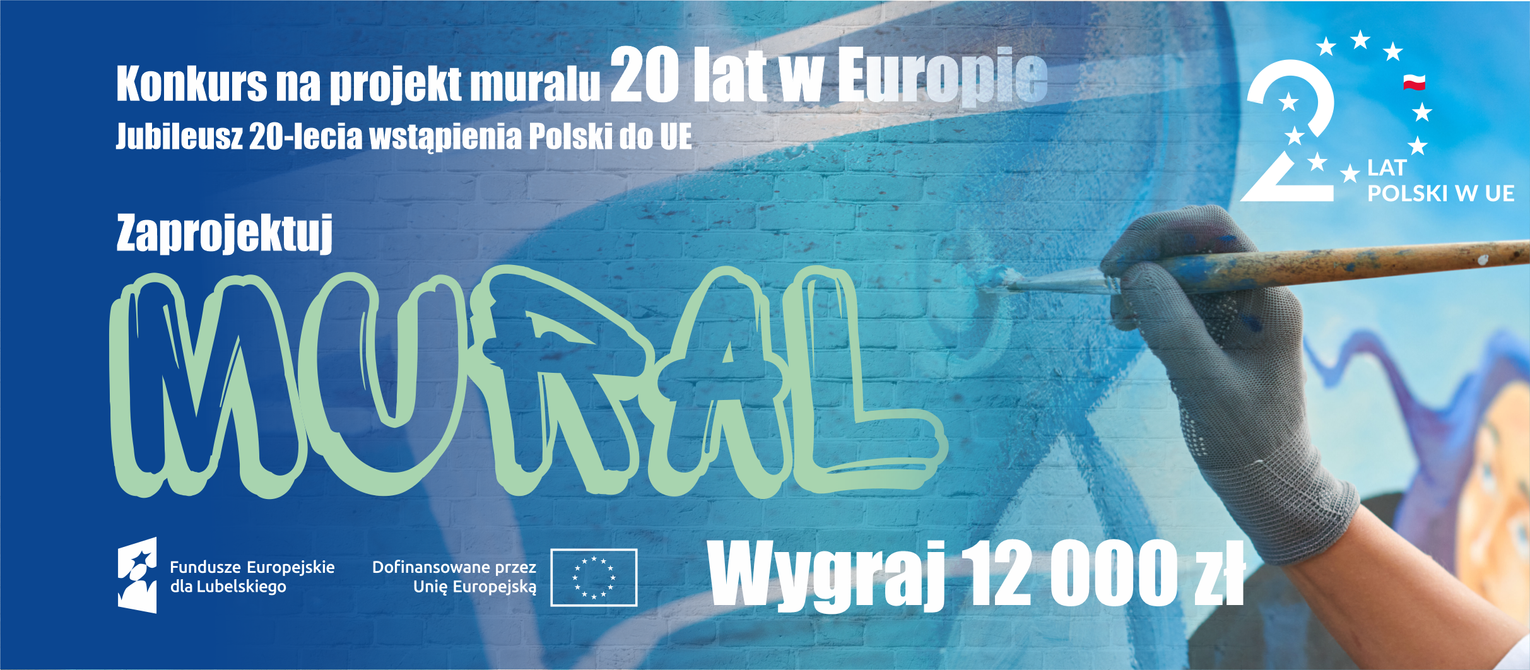Zarząd Województwa Lubelskiego ogłasza Konkurs na projekt muralu z okazji 20 – lecia wstąpienia Polski do Unii Europejskiej. Aby zaistnieć w przestrzeni publicznej i powalczyć o nagrodę należy stworzyć projekt graficzny muralu, który swym charakterem i tematyką w kreatywny i nieszablonowy sposób poruszy zagadnienia związane ze zmianami, jakie zaszły w naszym regionie od momentu przystąpienia Polski do Unii Europejskiej. Konkurs jest otwarty dla wszystkich osób pełnoletnich. Warunkiem przystąpienia do rywalizacji jest złożenie projektu, który możliwie szczegółowo będzie oddawał wygląd przyszłego muralu oraz zawierał logotypy: 20 lat Polski w Unii Europejskiej i Programu Fundusze Europejskie dla Lubelskiego 2021-2027. Projekt musi być oryginalny, wykonany specjalnie na potrzeby tego konkursu oraz powinien odznaczać się wysoką wartością artystyczną i przykuwać uwagę. Nagrodą w konkursie jest 12 000,00 zł (13 200,00 zł brutto), a także powielenie zwycięskiego projektu w 24 lokalizacjach na terenie województwa lubelskiego. Mural zostanie wykonany na wybranych ścianach zewnętrznych w Lublinie, Chełmie, Zamościu i Białej Podlaskiej, a także w Opolu Lubelskim, Lubartowie, Włodawie, Tomaszowie Lubelskim, Łukowie, Krasnystawie, Rejowcu Fabrycznym, Biłgoraju, Parczewie, Świdniku, Hrubieszowie, Kraśniku, Łęcznej, Radzyniu Podlaskim, Bełżycach, Puławach, Rykach, Janowie Lubelskim, Międzyrzecu Podlaskim oraz w Szczebrzeszynie. Prace konkursowe należy dostarczyć do siedziby Organizatora w terminie do dnia 31 grudnia 2024 roku, pocztą lub osobiście pod adres: Urząd Marszałkowski Województwa Lubelskiego, Departament Zarządzania Programami Regionalnymi, ul. Stefczyka 3b, 20-151 Lublin. Szczegóły w regulaminie konkursu dostępnym na stronie: funduszeUE.lubelskie.pl
