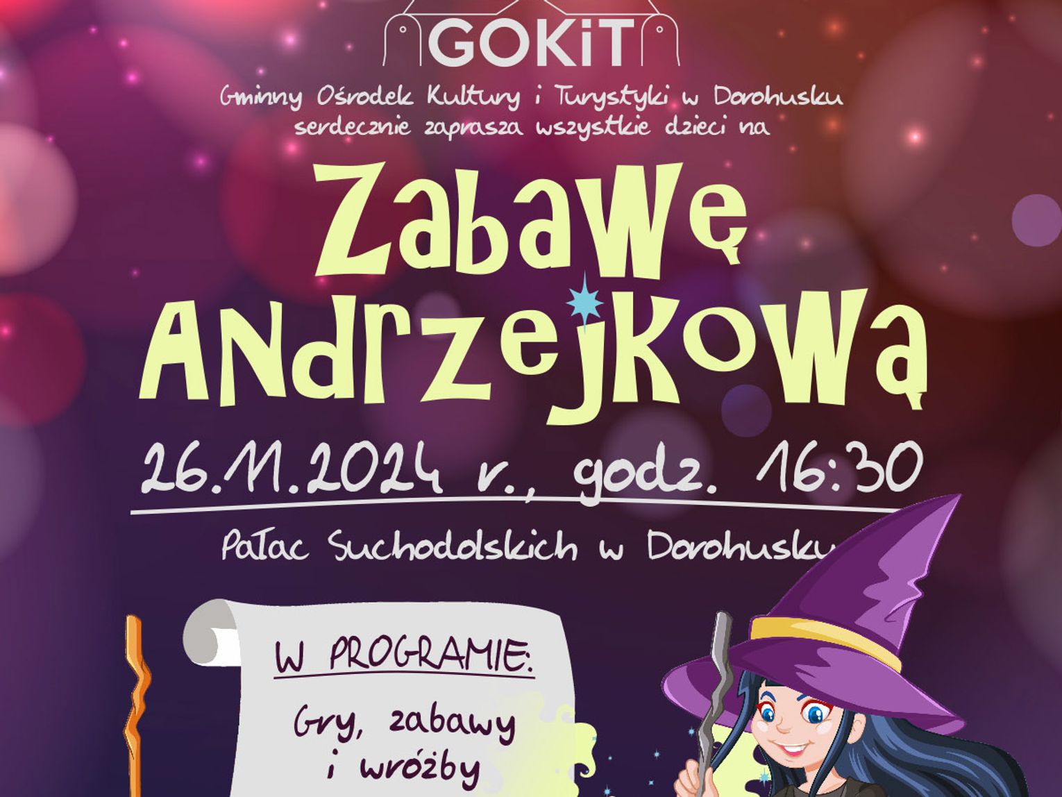 W programie przewidziano liczne atrakcje dla dzieci, takie jak: gry i zabawy, wróżby, dyskotekę, możliwość wykonania brokatowych tatuaży oraz słodki poczęstunek.