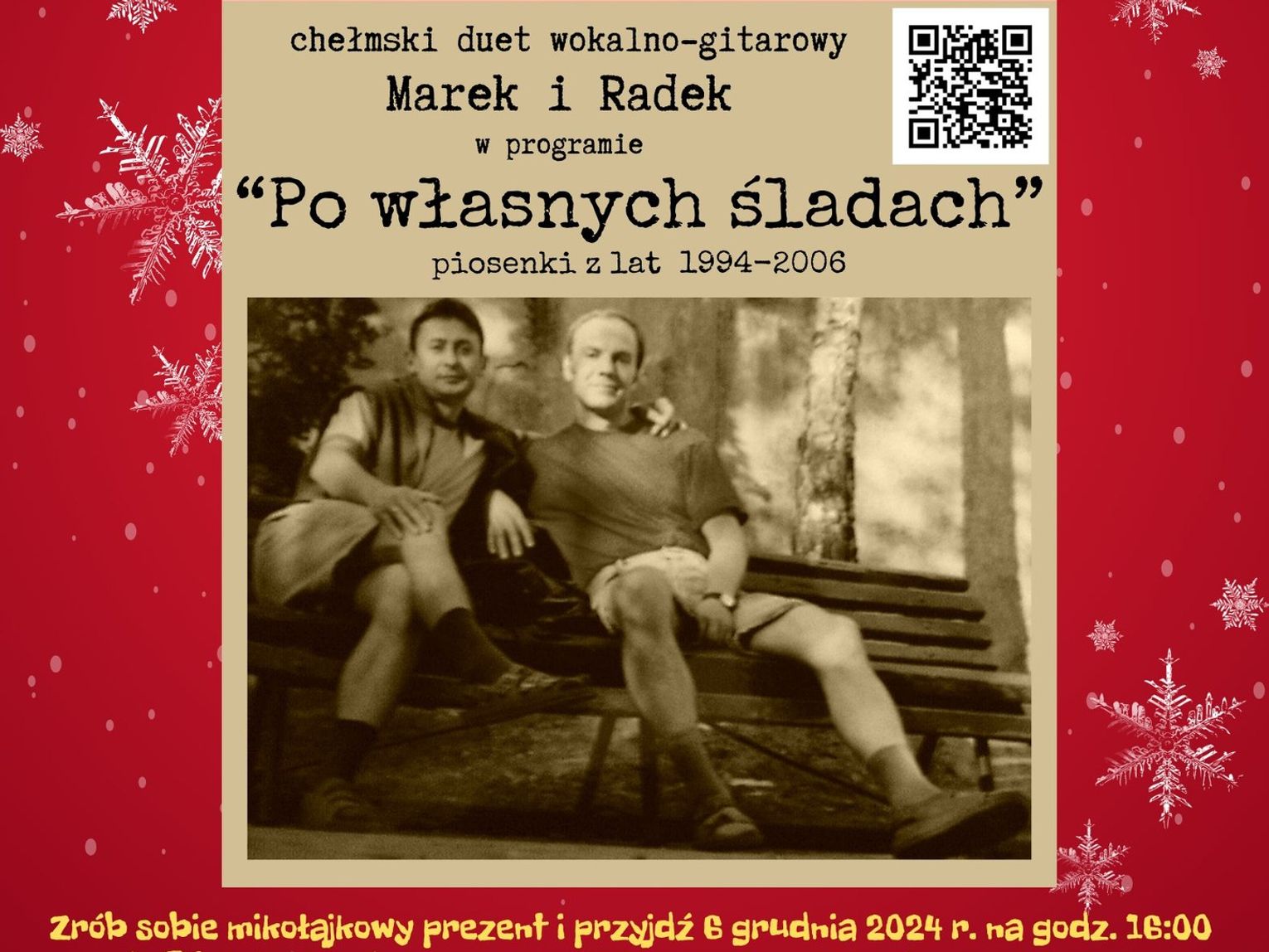 Głównym muzycznym akcentem wieczoru będzie występ chełmskiego duetu wokalno-gitarowego Marek i Radek. Choć zespół istnieje już od 1994 roku, jego członkowie przez lata pozostawali w cieniu, występując głównie dla najbliższego kręgu przyjaciół i znajomych. Jednak ich talent i pasja przetrwały próbę czasu. Z okazji 30-lecia istnienia duetu, Marek Miszczuk i Radosław Szewczuk postanowili powrócić na scenę, by zaprezentować swój repertuar.