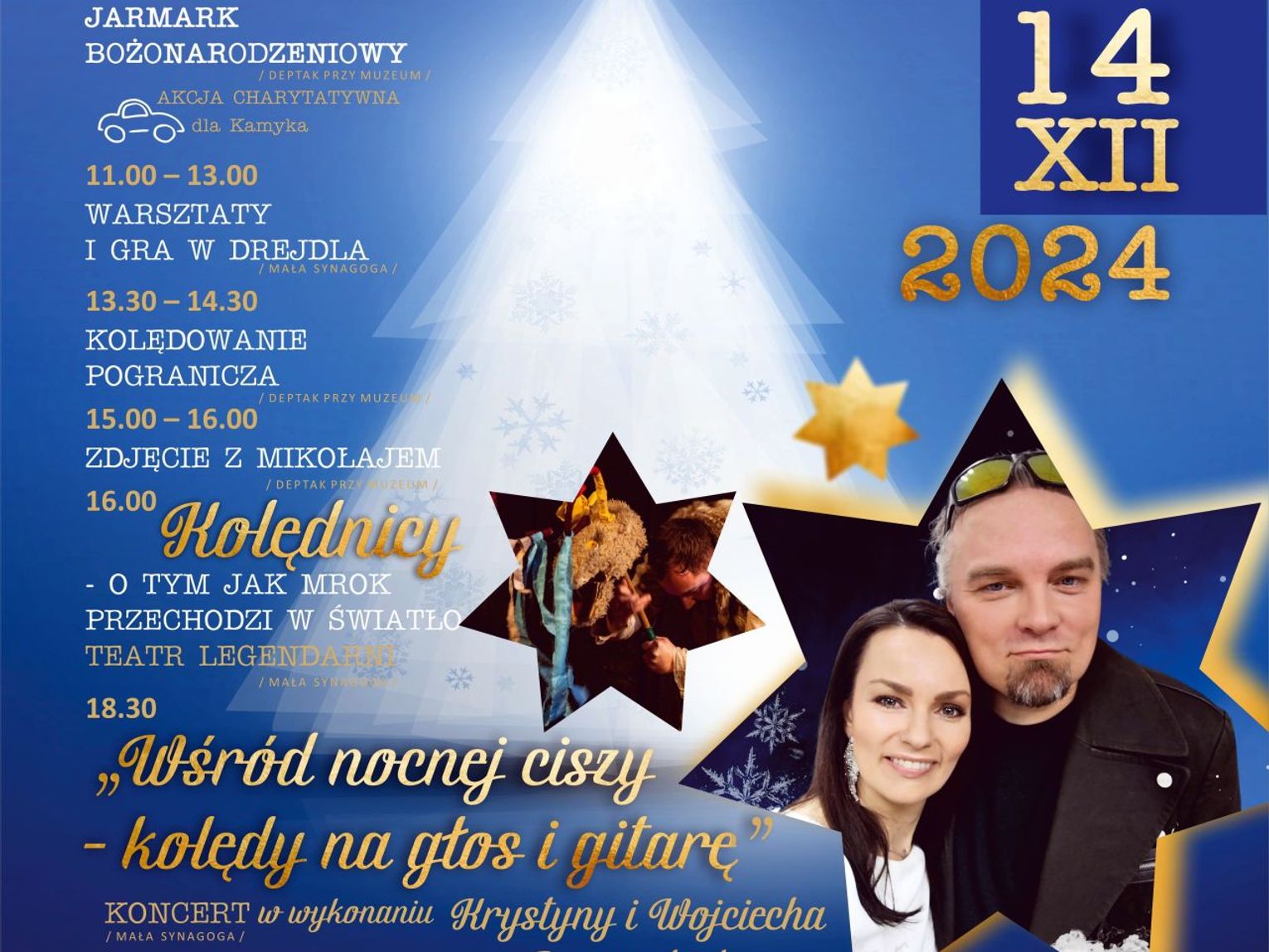 Od 16:00 w Małej Synagodze odbędzie się spektakl „Kolędnicy – O tym, jak mrok przechodzi w światło” w wykonaniu Legendarnej Grupy Teatralnej w Małej Synagodze, a gwoździem programu będzie wspólne kolędowanie oraz koncert Krystyny i Wojciecha Cugowskich zatytułowany „Wśród nocnej ciszy – kolędy na głos i gitarę” o godzinie 18:30.