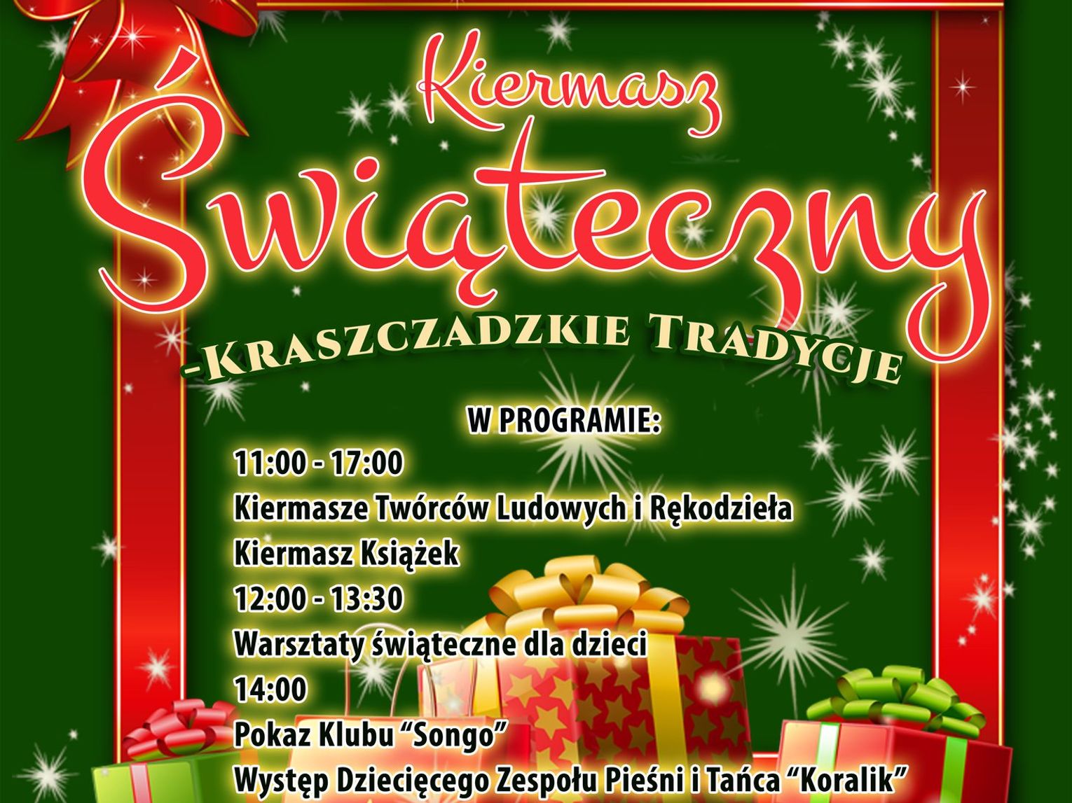 Po południu, o godzinie 14:00, organizatorzy zapraszają na pokaz klubu "Songo", a następnie na występ Dziecięcego Zespołu Pieśni i Tańca "Koralik". Natomiast o godzinie 14:30 rozpocznie się przedświąteczny koncert, podczas którego wystąpią: Klub Solisty, Zespół Muzyczny "Ballada" z Małochwieja Dużego oraz Żeńska Grupa Teatralna z Bzitego ze swoim "Świątecznym widowiskiem".