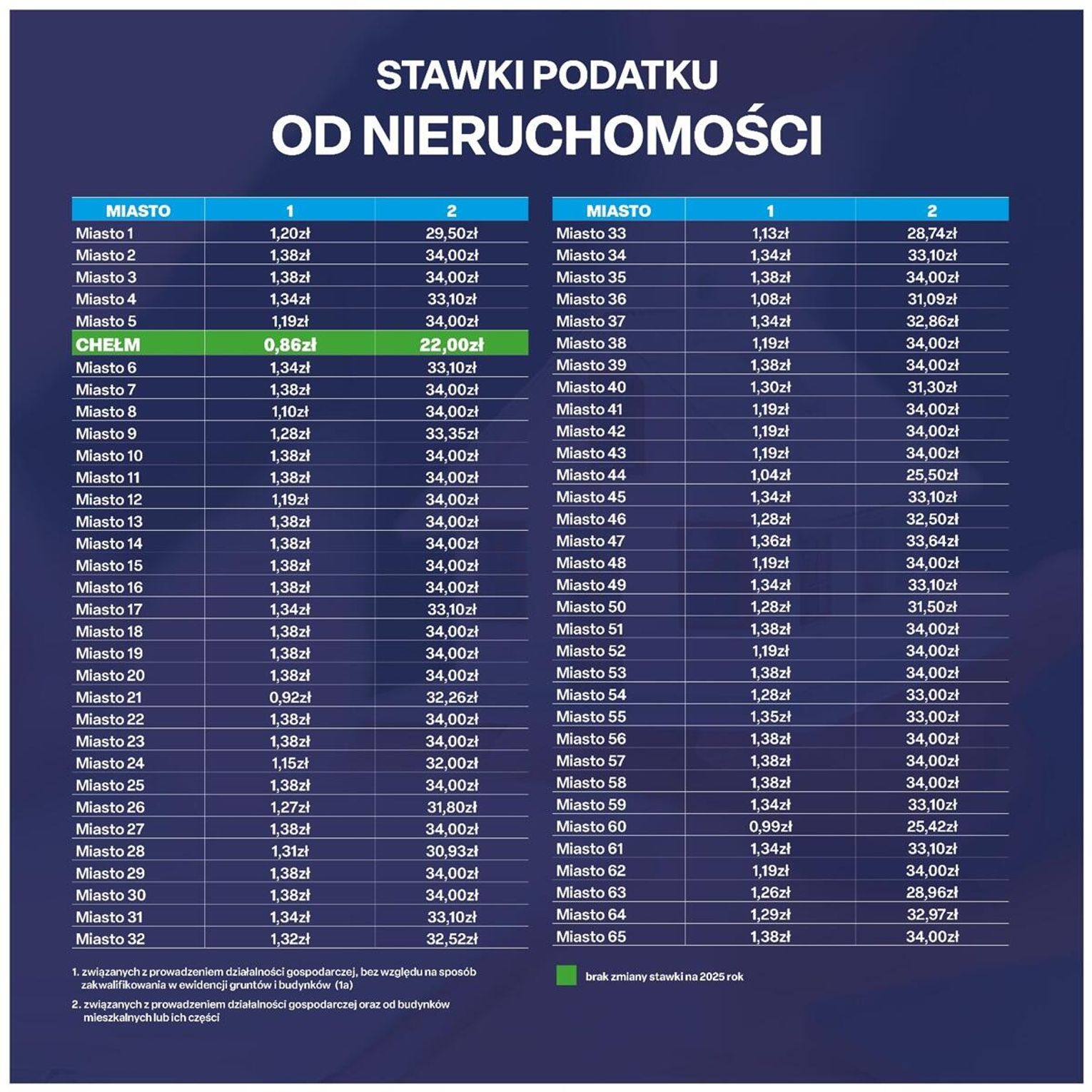 Władze miasta chwalą się, że Chełm ma jedną z najniższych stawek podatku od nieruchomości spośród wszystkich miast na prawach powiatu w Polsce. Prezydent Chełma podkreśla, że pozostaje na niezmiennym poziomie od 8 lat. Od kiedy objął urząd prezydenta miasta, nie zdecydował się na jej podwyższenie. Twierdzi, że to była przemyślana decyzja.