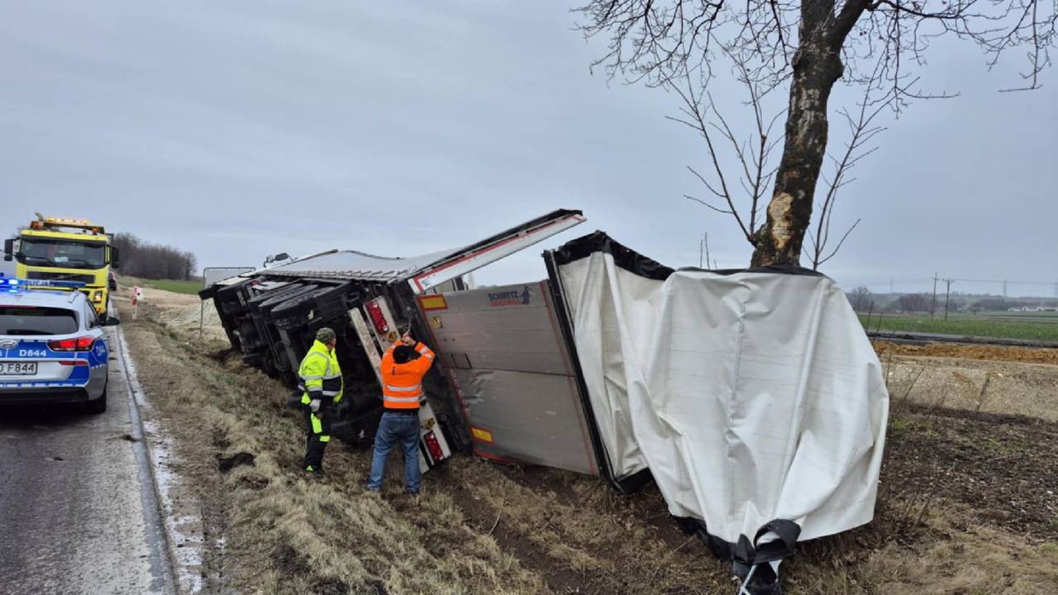 Około godziny 9.00 auto ciężarowe wywróciło się w rowie na bok. Na szczęście nic nikomu się nie stało. Na miejsce wezwano policję i pomoc drogową. Ruch przez pewien czas był trochę utrudniony.