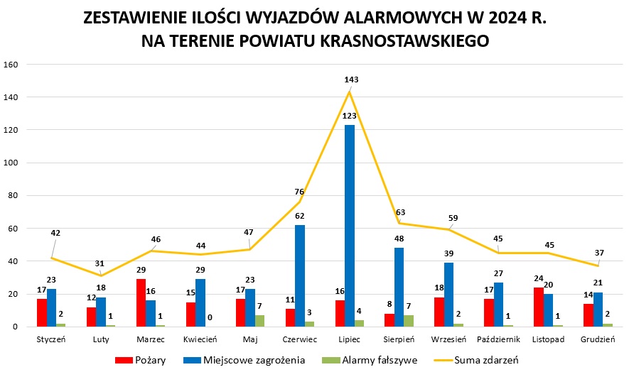 W 2024 roku jednostki straży pożarnej w Krasnymstawie odnotowały 678 wyjazdów do akcji. Statystyki wskazują na 198 pożarów, 449 miejscowych zagrożeń i 31 fałszywych alarmów. W porównaniu z 2023 rokiem liczba interwencji spadła o 9.