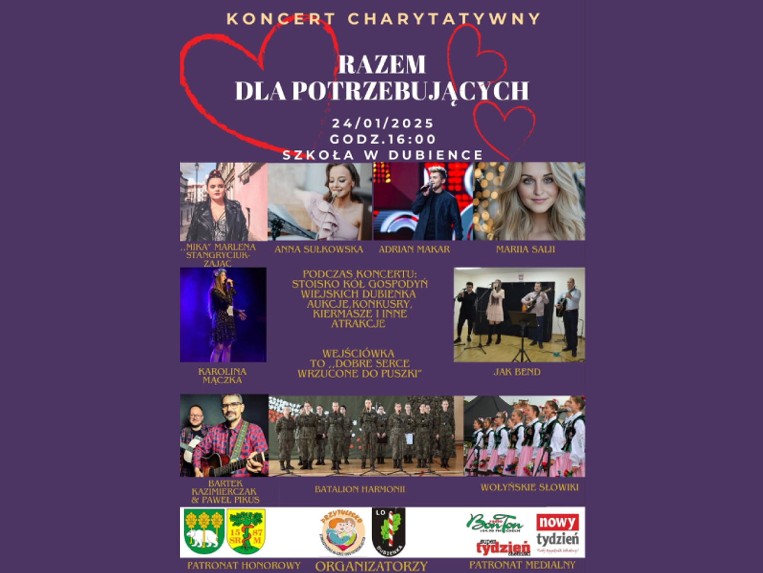 W repertuarze koncertu znalezli się: "Mika" Marlena Stangryciuk-Zając, Anna Sułkowska, Adrian Makar, Maria Salii, Karolina Mączka, Jak Bend, Bartek Kazimierczak & Paweł Pikus, Batalion Harmonii oraz Wołyńskie Słowiki. Różnorodność muzyczna gwarantuje, że każdy znajdzie coś dla siebie.