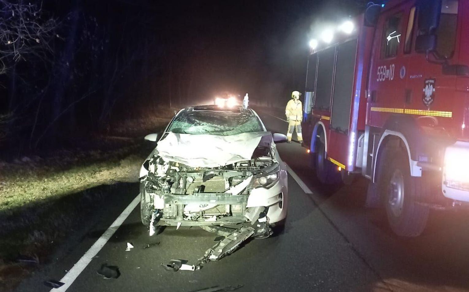 Do zdarzenia doszło w piątek (24 stycznia) koło godziny 17.00. 38-latek jechał w Dominiczynie drogą krajową w samochodzie marki Kia z 10-letnim chłopcem. Nagle na szosie pojawiły się dwa łosie. Jeden wpadł wprost pod koła. Zwierzę zginęło na miejscu. Na szczęście ani kierowcy, ani dziecku nic się nie stało. Auto zostało jednak zniszczone, nie nadawało się do jazdy, więc kierowca musiał oddać dowód rejestracyjny policji.