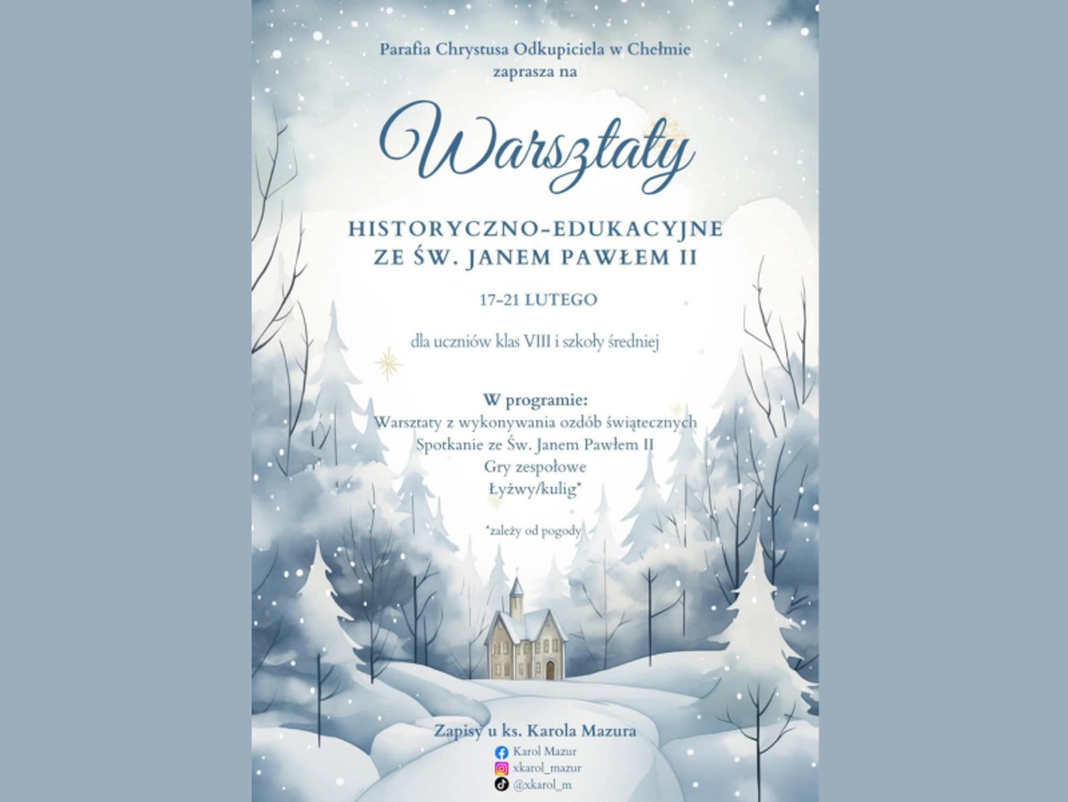 W programie warsztatów znajdą się zarówno elementy edukacyjne, jak i rekreacyjne. Młodzież będzie miała okazję wziąć udział w warsztatach z wykonywania ozdób świątecznych, a także "spotkać się" ze św. Janem Pawłem II. Nie zabraknie również gier zespołowych oraz, w zależności od pogody, wyjścia na łyżwy lub kuligu.