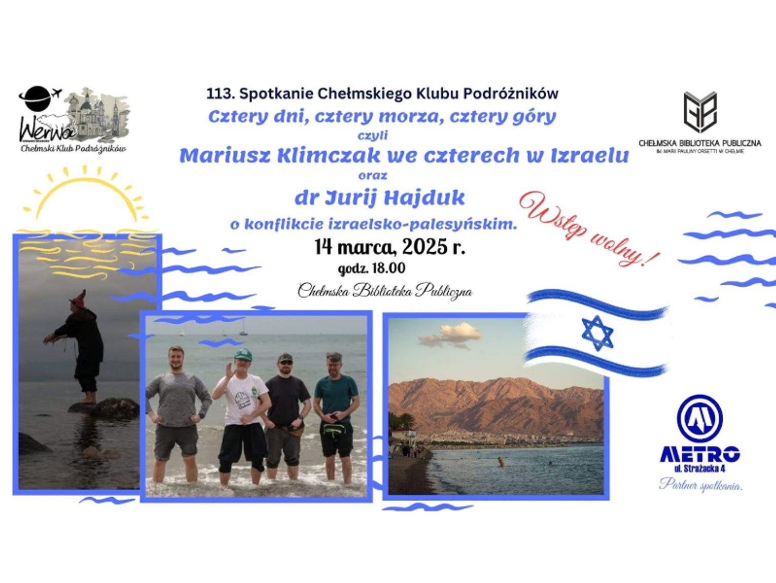 Gościem specjalnym wieczoru będzie Mariusz Klimczak, który podzieli się wrażeniami z podróży do Izraela. Jego prezentacja zatytułowana „Cztery dni, cztery morza, cztery góry” zabierze uczestników w podróż po tym kraju. Prelegent zaprezentuje bogactwo kulturowe i przyrodnicze Izraela, ukazując zarówno jego piękno, jak i współczesne wyzwania.