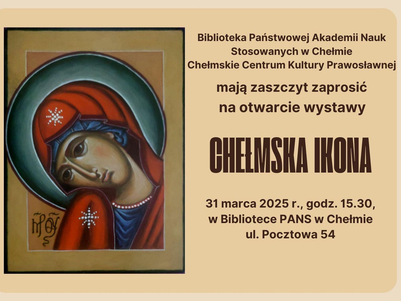 Ostatnie półtora roku zaawansowani uczestnicy warsztatów poświęcili pracy nad ikonami Matki Boskiej Chełmskiej. Efekty ich pracy będzie można podziwiać na wystawie, gdzie swoje dzieła zaprezentują: Dorota Czerniakiewicz, Ewa Hordejuk, Ewa Wójtowicz, Beata Walczuk oraz Wiesław Trzpis.