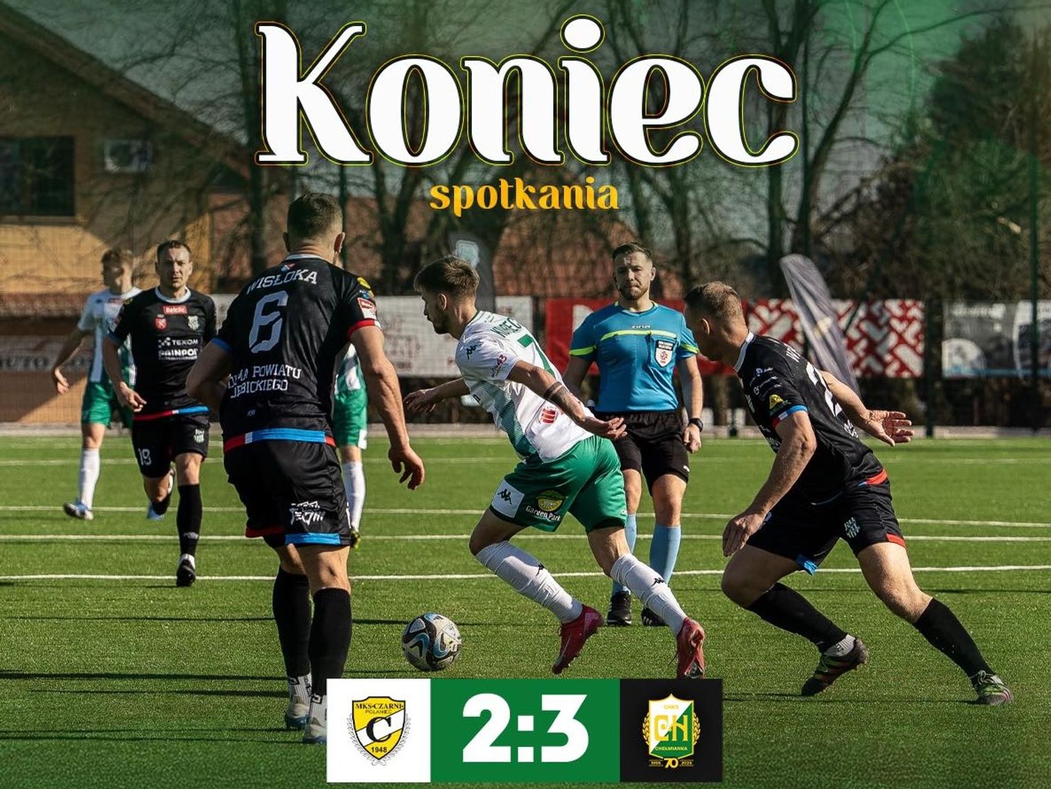Druga część meczu obfitowała w kolejne sytuacje, a gra się zaostrzyła. Do wyrównania gospodarze doprowadzili w 54. minucie, kiedy strzał na bramkę Michała Jerke (zastąpił kontuzjowanego Jakuba Grzywaczewskiego) oddał Krystian Kardyś, piłka się odbiła i dobił ją Adam Kramarz. Czas do końca meczu płynął, a wynik się nie zmieniał, chociaż były ku temu okazje m.in. Bartłomieja Korbeckiego i Michala Kleca. Czarni Połaniec niechcący sprawili jednak prezent Chełmiance, kiedy na kwadrans przed końcem Mateusz Chmielowiec sfaulował Krystiana Mroczka i resztę meczu oglądał jako kibic. Biało-zieloni grający w przewadze jednego zawodnika wykorzystali handicap w 88. minucie, kiedy "zaległość" nadrobił Michal Klec, zdobywając trzeciego gola i fundując swojemu zespołowi wyjazd z kompletem punktów.