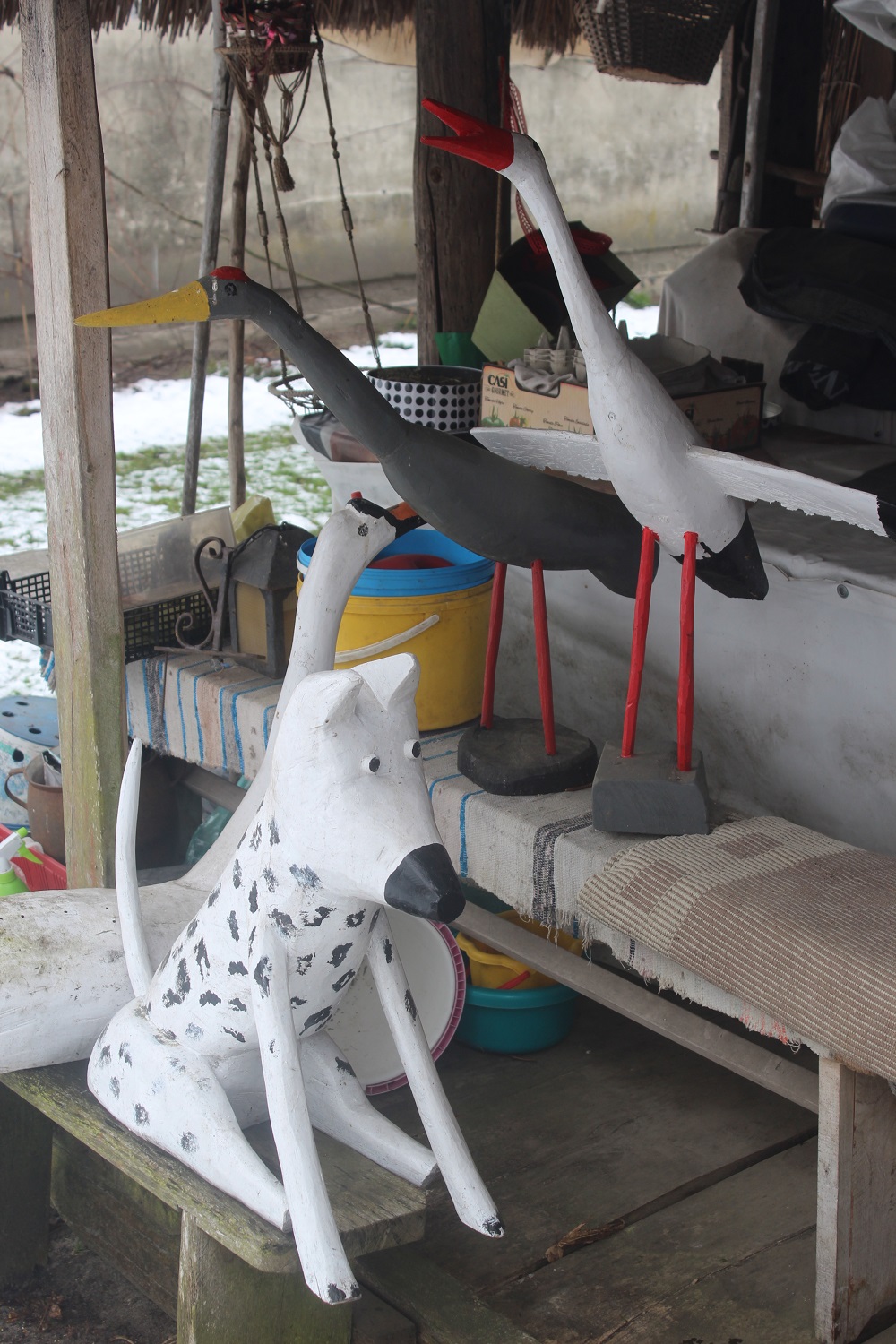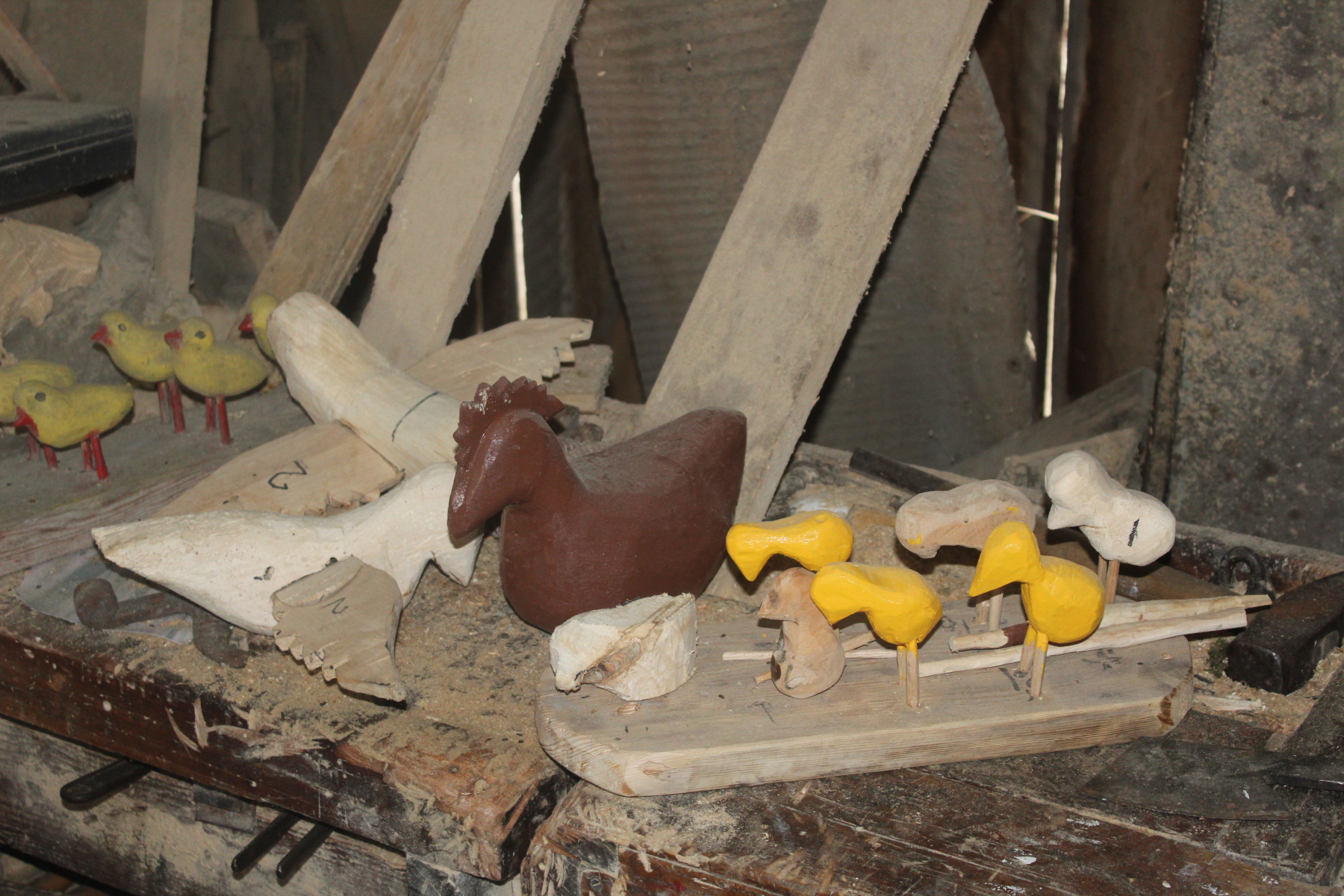 Na dachu konstrukcji znalazła się słoma z żyta, które pan Józef osobiście kosił na polu u kuzyna, a później wymłócił osobiście w stodole. To właśnie obok słynnego już dzisiaj „skansenu” pana Józefa zrodziły się jego pierwsze, rzeźbiarskie pomysły. Najpierw był kogut. Piękny, biały osobnik, który przed laty przechadzał się po podwórzu Felczyńskich, został więc uwieczniony już na zawsze.