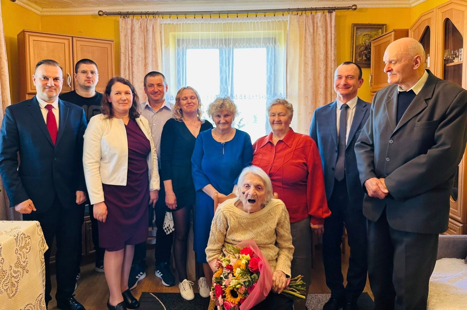Panią Janinę odwiedził wójt gminy Artur Sawa wspólnie z Tomaszem Żołyniakiem (przewodniczącym rady gminy), Martą Woźniak (kierownikiem GOPS-u), oraz Agnieszką Wójtowicz (zastępcą kierownika USC).