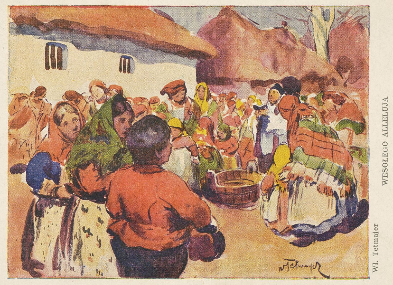 W Wielką Sobotę ksiądz święcił ogień, wodę oraz pokarmy. Jadło święcono zazwyczaj w chałupie najbogatszego gospodarza albo na wolnym powietrzu, np. pod przydrożnym krzyżem, gdzie wszyscy mieszkańcy wsi przynosili swoje kosze. Wkładano do nich dużo jaj, bochenek chleba, żeby go nigdy w domu nie brakowało, pęta kiełbasy, boczek, ser, masło, cały chrzan oraz sól. Dokładnie sprawdzano, czy wszystko jest. Jeśli czegoś by zabrakło, byłaby to zła wróżba.