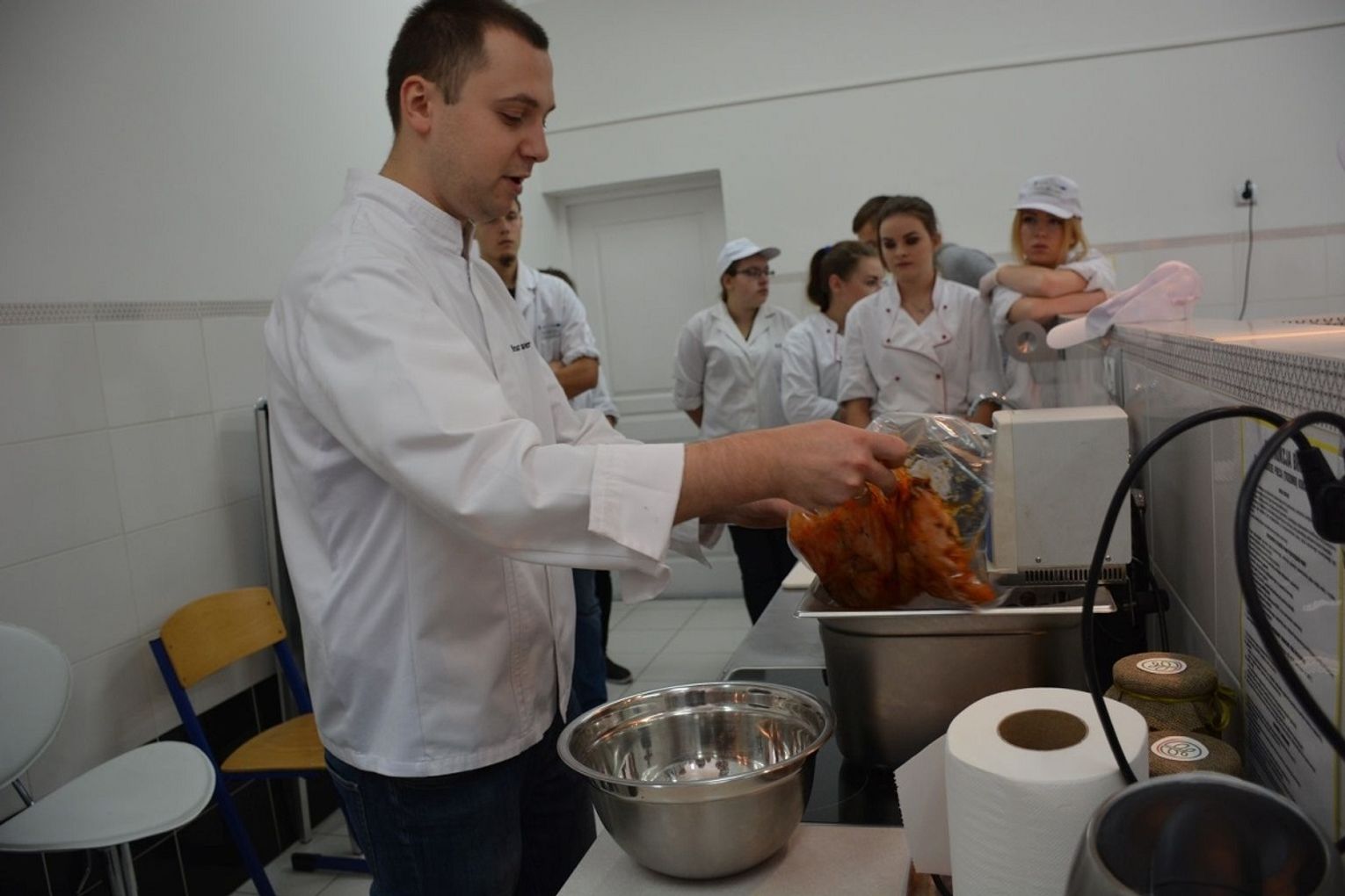 Uczestników warsztatów powitała wicedyrektor szkoły Anna Kowalik. Obecnych było 20 uczniów z klas pierwszych, drugich i trzecich kształcących się w zawodzie technik żywienia i usług gastronomicznych oraz Justyna Marciniak i Magdalena Smolira z Agencji Rynku Rolnego i nauczyciele przedmiotów zawodowych. Zajęcia prowadził kucharz Artur Wawer z firmy Awangarda.
