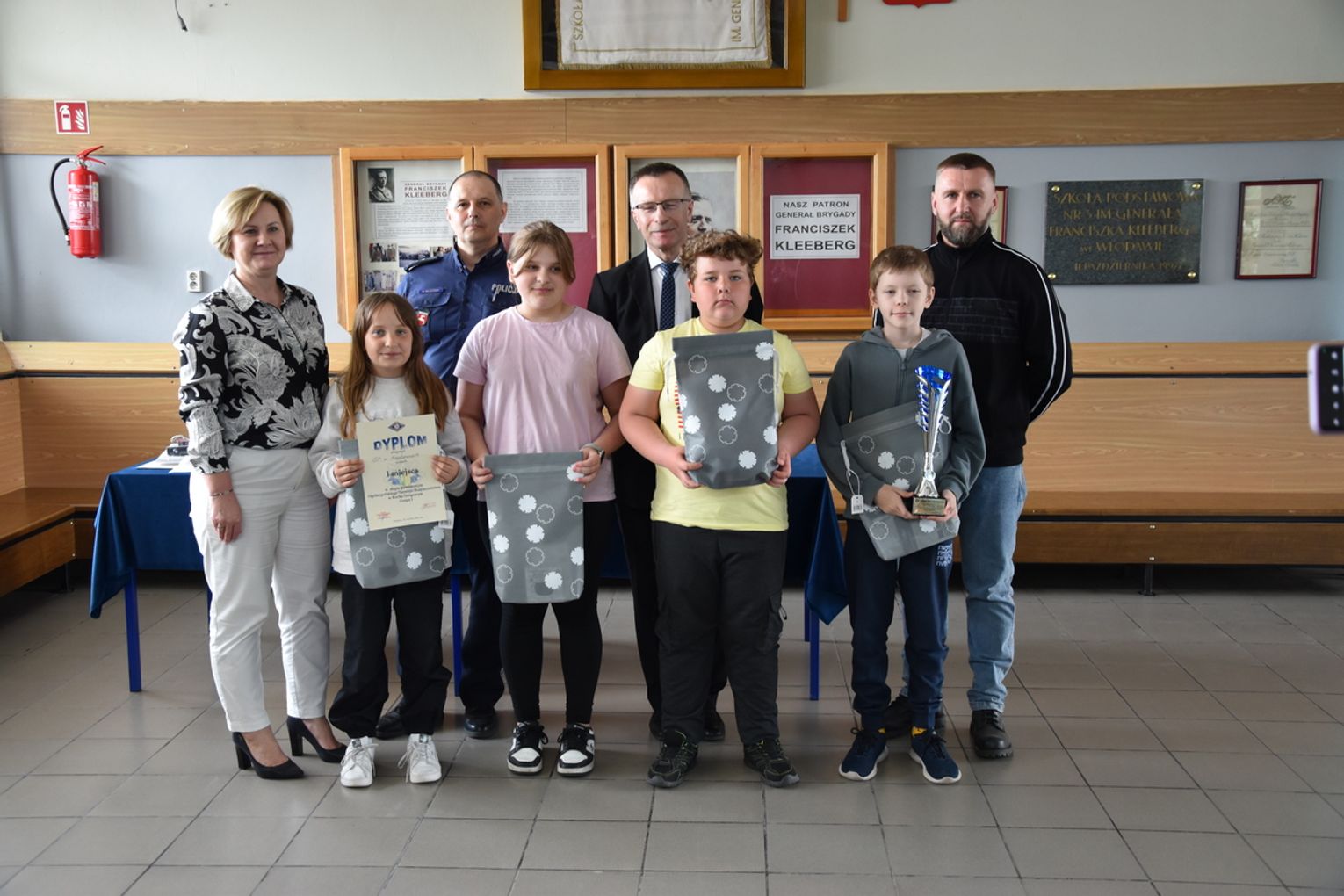 Dyrektor Szkoły Podstawowej Nr 3 we Włodawie wspólnie z naczelnikiem Wydziału Ruchu Drogowego włodawskiej komendy i przedstawicielem Starostwa Powiatowego we Włodawie wręczyli nagrody drużynom ufundowane przez sponsorów.