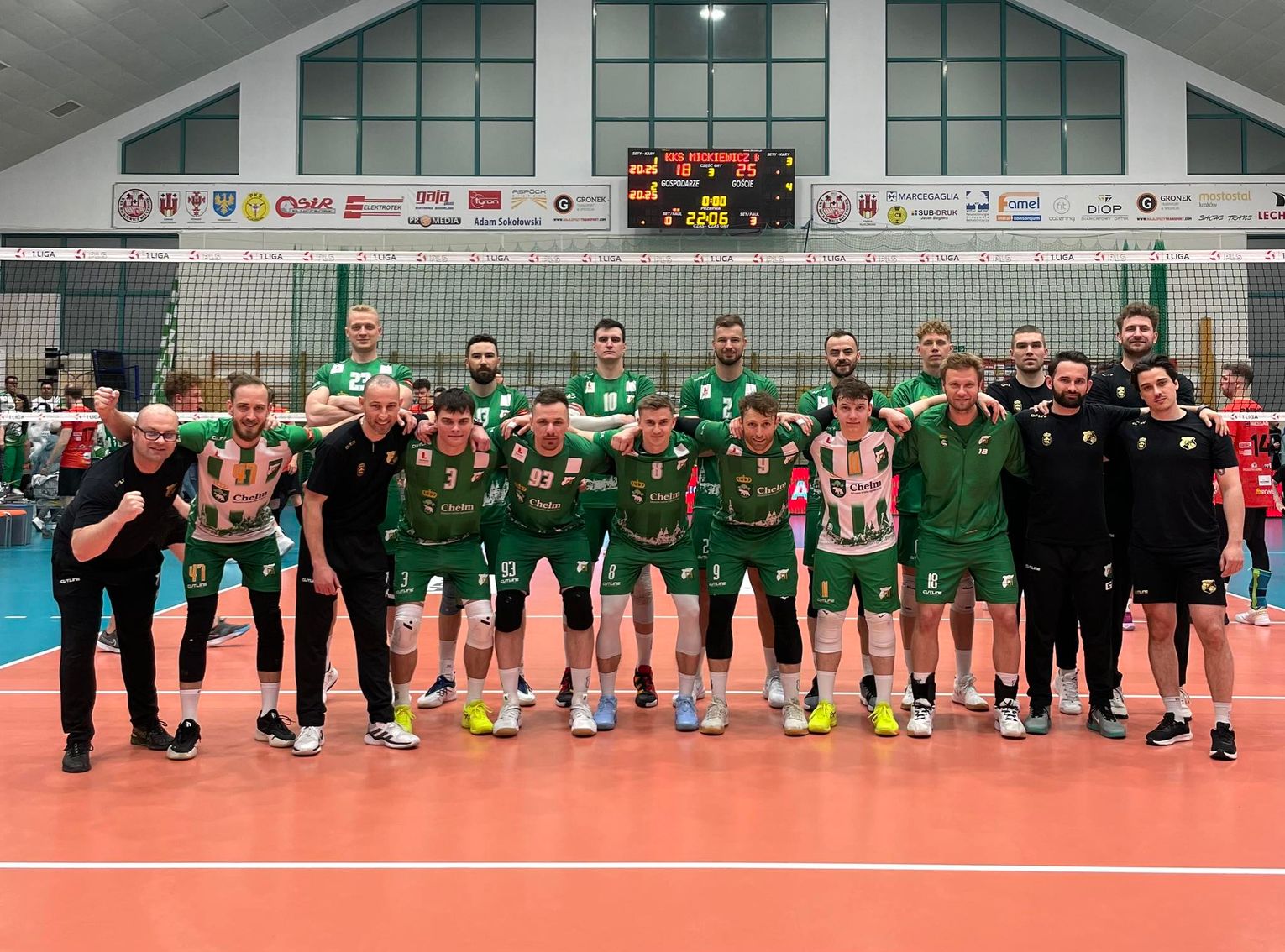 Gospodarze spotkania od samego początku pierwszego seta jasno dawali do zrozumienia, że na swoim terenie czują się pewnie. Rozpoczęli od zgarnięcia dwóch punktów pod rząd, kiedy w polu zagrywki był obecny Mariusz Magnuszewski i do połowy partii utrzymywali minimalną przewagę nad przyjezdnymi, po drodze dorzucając m.in. asa autorstwa Artura Pasińskiego. Momentem zwrotnym był wynik 11:11, po którym szczelnymi blokiem Mariusza Marcyniaka i Łukasza Swodczyka ChKS wyszedł po raz pierwszy na prowadzenie. Chwilę później ponownie blok naszego kapitana, tym razem w duecie z Jakubem Buckim, podwyższył przewagę, niemniej jednak Kluczborczanom udało się wyrównać po tym jak Janusz Górski obił blok przyjezdnych. Był to jednak ostatni zryw gospodarzy w tej partii, ponieważ goście z Chełma zaczęli odskakiwać, m.in. dzięki blokowi Mariusza Marcyniaka i Jay'a Blankenau, ofensywnego grze naszego kapitana oraz asie serwisowym Pawła Rusina. Ostatecznie przy setballu biało-zielonych błąd zagrywki popełnił Michał Kozłowski i ChKS zgarnął pierwszego seta.