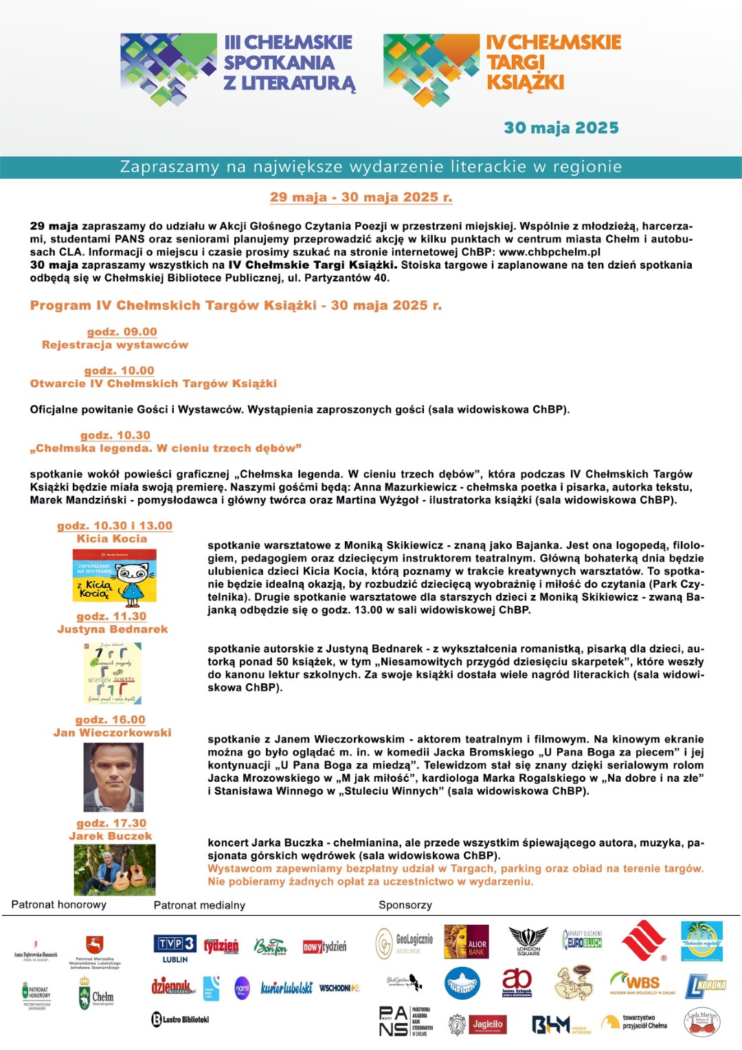 Tegoroczny program targów rozpoczyna się o godzinie 10:30, spotkaniem warsztatowym z Moniką Skikiewicz (Bajanką) i Kicią Kocią w Parku Czytelnika. Godzinę później, o 11:30 odbędzie się spotkanie autorskie z Justyną Bednarek, autorką książki „Niesamowite przygody dziesięciu skarpetek”, w sali widowiskowej Chełmskiej Biblioteki Publiczne. O godzinie 13:00, zaplanowane jest kolejne spotkanie warsztatowe dla starszych dzieci z Moniką Skikiewicz i Kicią Kocią tym razem w sali widowiskowej. Po południu, o godzinie 16:00, będzie można wziąć udział w spotkaniu z aktorem Janem Wieczorkowskim. Zwieńczeniem targów będzie koncert, o godzinie 17:30, Jarka Buczka, chełmianina, śpiewającego autora i muzyka.