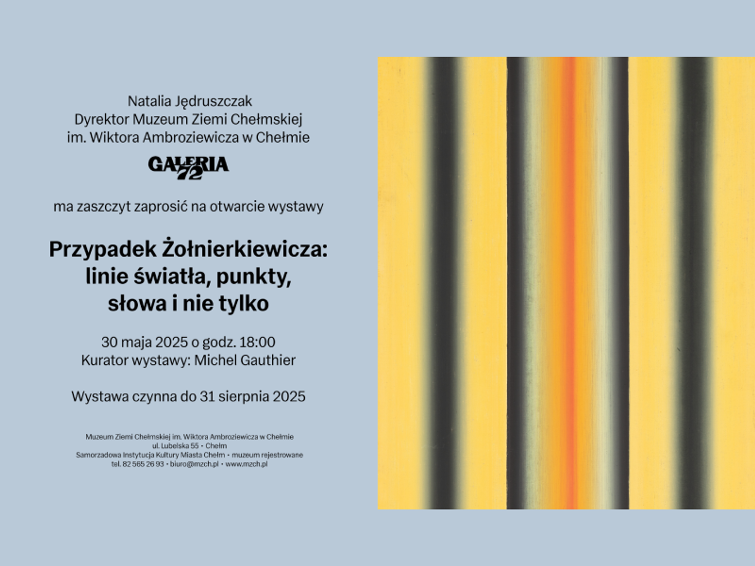 – Wyjątkowość tego pokazu rozpatrywać możemy z kilku perspektyw: po pierwsze będzie to pokaz dzieła artysty, którego twórczość nie jest szeroko znana i rozpoznawalna, a jednak zasługująca na przypomnienie w najlepszych przestrzeniach galeryjnych, po drugie, przypomnienie spuścizny prof. Tomasza Żołnierkiewicza (1935-2018) będzie nam dane dzięki współpracy i wsparciu tego szczególnego wydarzenia przez Fundację Stefana Gierowskiego, a po trzecie, kuratorem ten niezwykłej prezentacji będzie Michel Gauthier – wybitny kurator i znawca polskiej awangardy powojennej z Centrum Pompidou w Paryżu – mówi Jagoda Barczyńskie, kierownik działu sztuki współczesnej i Galerii 72 w muzeum.