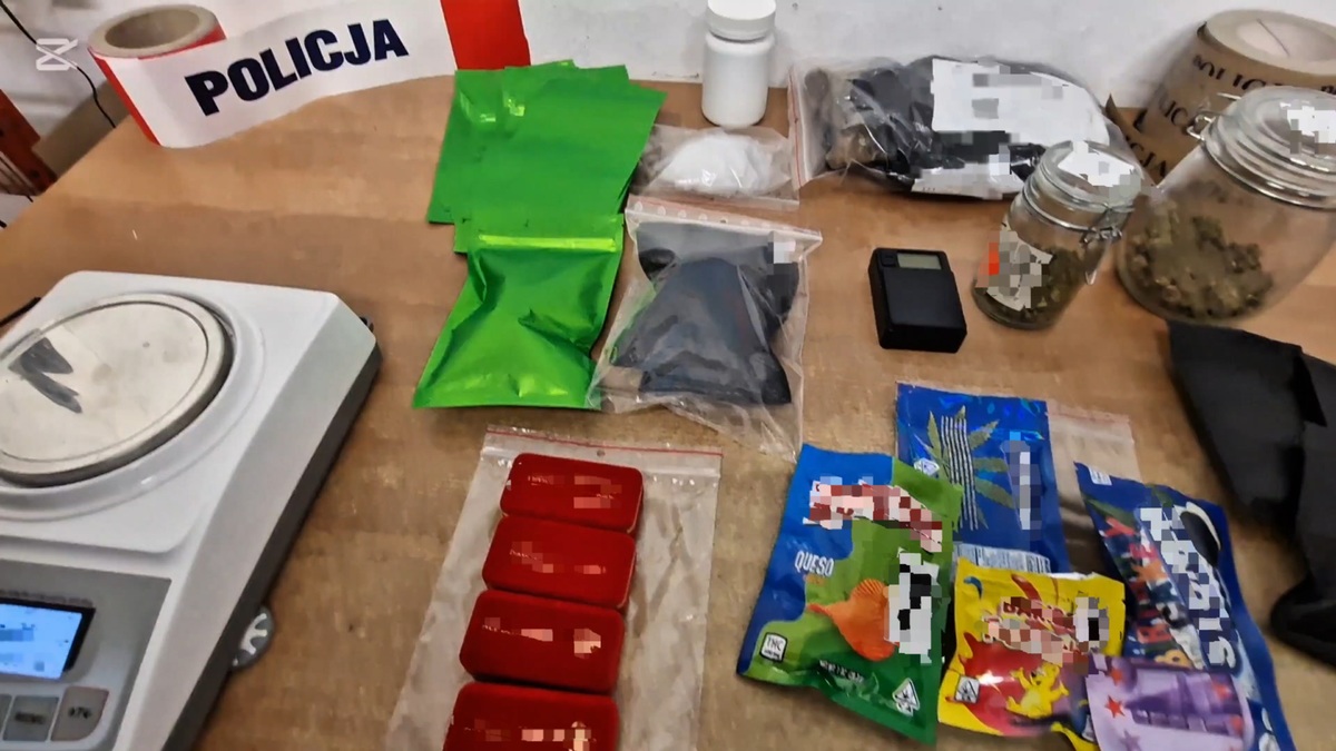 Policjanci przeszukali zarówno mieszkanie, jak i auto należący do 28-latka. W jednym z pokoi ujawnili znaczne ilości środków odurzających – zarówno w formie suszu roślinnego, jak i substancji twardych. Znaleziono także papierosy elektroniczne zawierające THC oraz produkty spożywcze – chipsy, ciastka i żelki – nasączone tą psychoaktywną substancją.