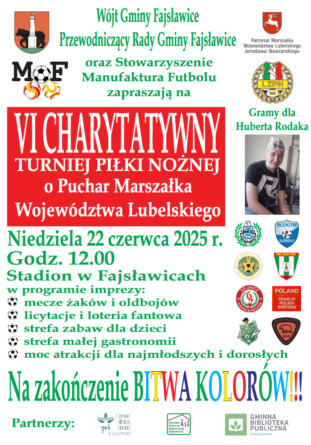 - Zapraszamy wszystkich na wspaniałe wydarzenie - VI Charytatywny Turniej Piłki Nożnej Oldbojów, który odbędzie się 22 czerwca w godzinach od 12:00 do 18:30 na boiskach przy budynku Urzędu Gminy Fajsławice. Wydarzenie objął patronatem marszałek województwa Lubelskiego Jarosław Stawiarski oraz Lubelski Związek Piłki Nożnej. Na uczestników czeka moc atrakcji, występów, licytacji i dobrej zabawy - zaprasza Aleksandra Granat z UG Fajsławice.