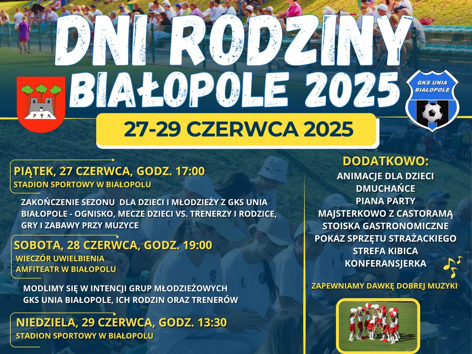 Sobota, 28 czerwca, poświęcona będzie aspektom duchowym i integracji modlitewnej. O godzinie 19:00 w Amfiteatrze w Białopolu odbędzie się „Wieczór Uwielbienia”. Będzie to czas modlitwy w intencji grup młodzieżowych GKS Unia Białopole, ich rodzin oraz trenerów.