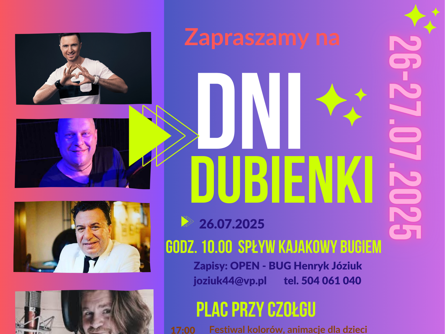 Dni Dubienki rozpoczną się 26 lipca (sobota) o godzinie 10:00 od spływu kajakowego Bugiem. Zapisy na spływ prowadzi Henryk Józiuk (OPEN - BUG) pod adresem [email protected] lub telefonicznie: 504 061 040. Popołudniowe i wieczorne atrakcje skoncentrują się na Placu przy Czołgu. Od godziny 17:00 najmłodsi będą mogli wziąć udział w Festiwalu Kolorów oraz licznych animacjach dla dzieci. Wieczór upłynie pod znakiem muzyki. O godzinie 19:30 na scenie pojawi się zespół Navarra, a po nim, o 20:30, wystąpi Mario Bischin, znany z dynamicznych rytmów. Noc zakończy Dyskoteka z DJ MADE IN SOUND, która potrwa do godziny 2:00.
