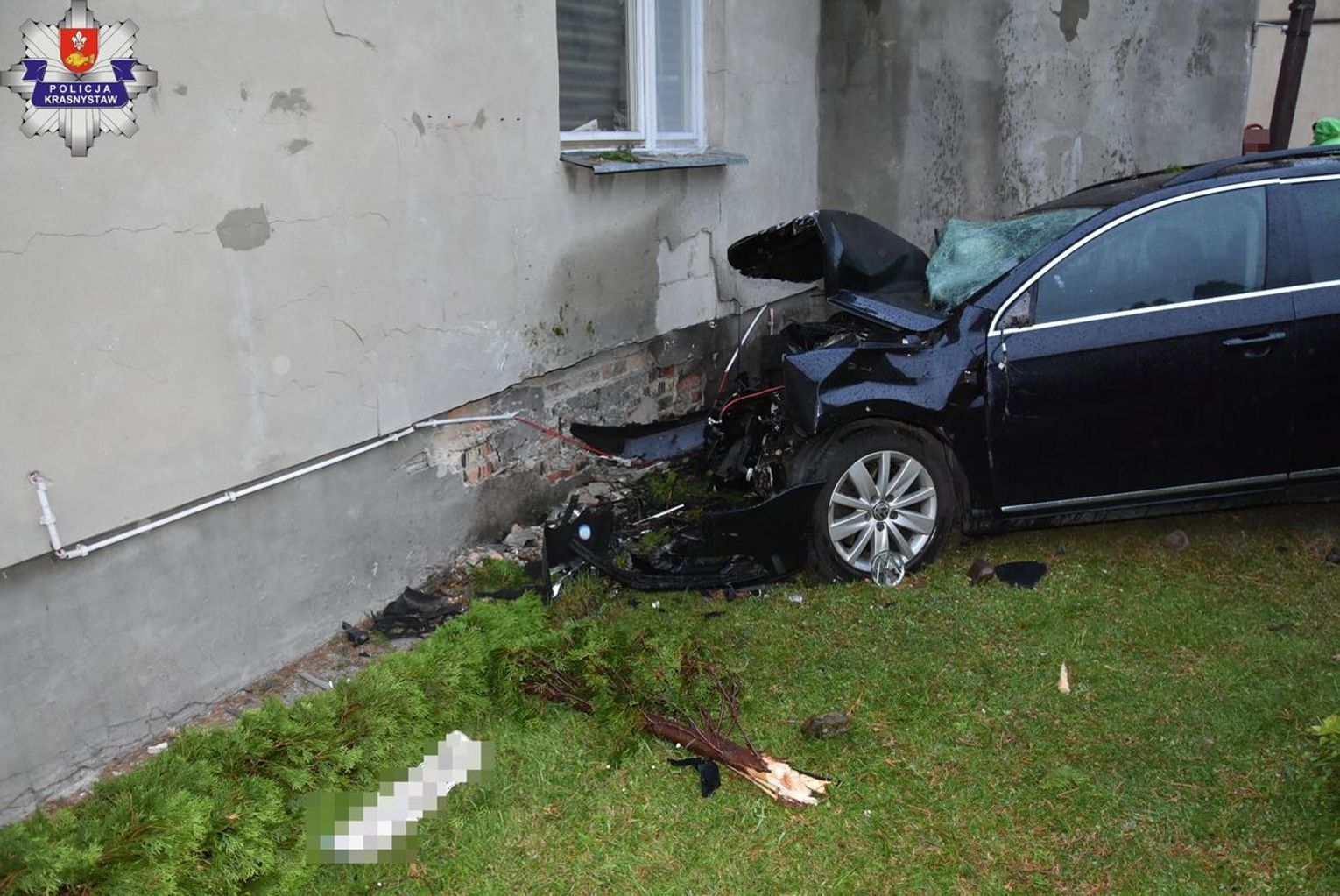 Do szarży doszło w nocy w sobotę (20 lipca) około godziny 1:00 w miejscowości Siennica Nadolna w powiecie krasnostawskim. Jak ustalili policjanci, 23-letni kierowca volkswagena, wyjeżdżając z drogi podporządkowanej, przejechał przez skrzyżowanie, uderzył w znak drogowy, a następnie z impetem wjechał w budynek mieszkalny.