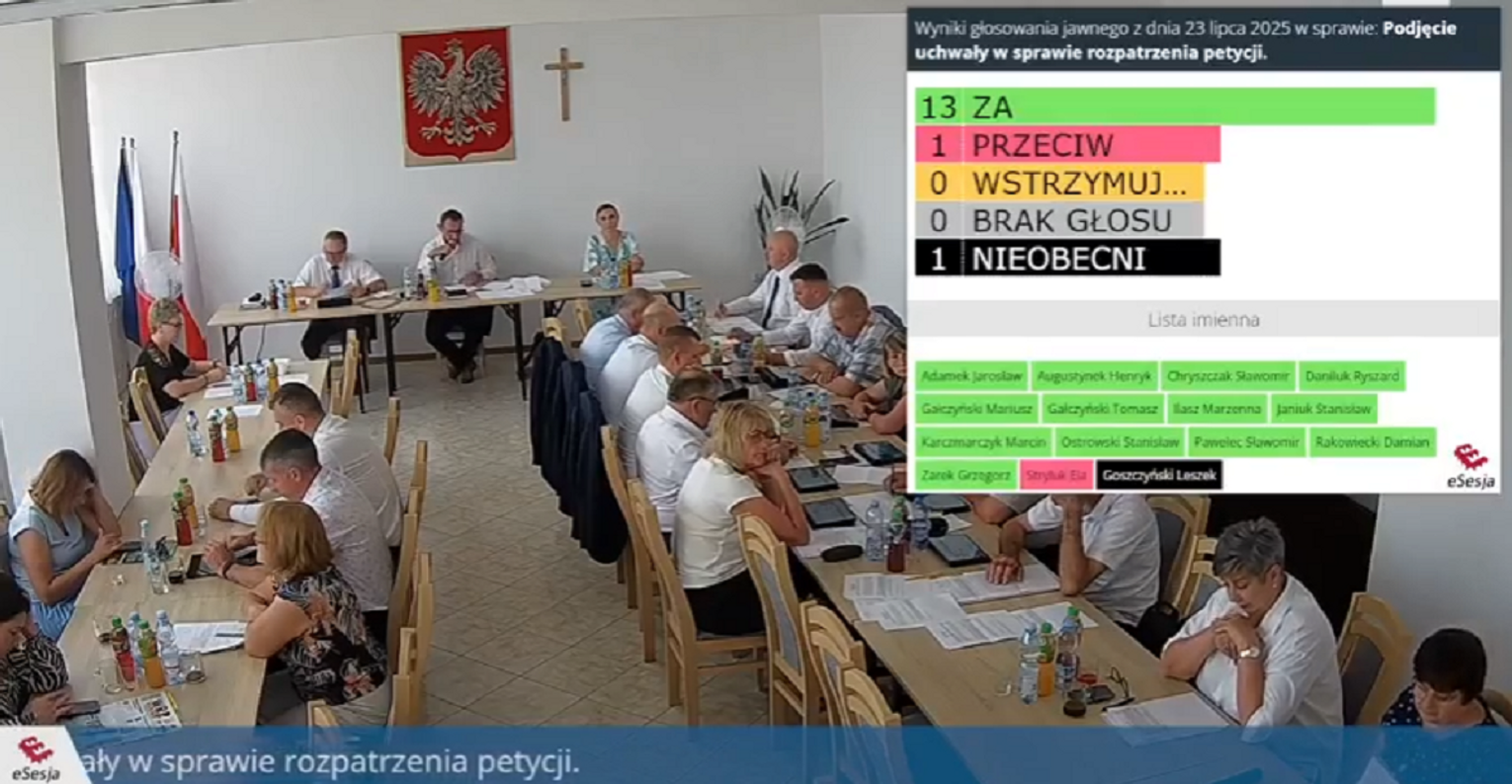 Ostatecznie więc, ze wskazanych wcześniej powodów, komisja uznała, że petycja nie zasługuje na uwzględnienie. Radni nie wnieśli żadnych uwag do projektu uchwały w sprawie petycji i została ona ostatecznie przyjęta 13 głosami „za”. Przeciwko wyrażonemu w uchwale stanowisku zagłosowała radna Ela Stryluk, a radny Leszek Goszczyński nie brał udziału w obradach.